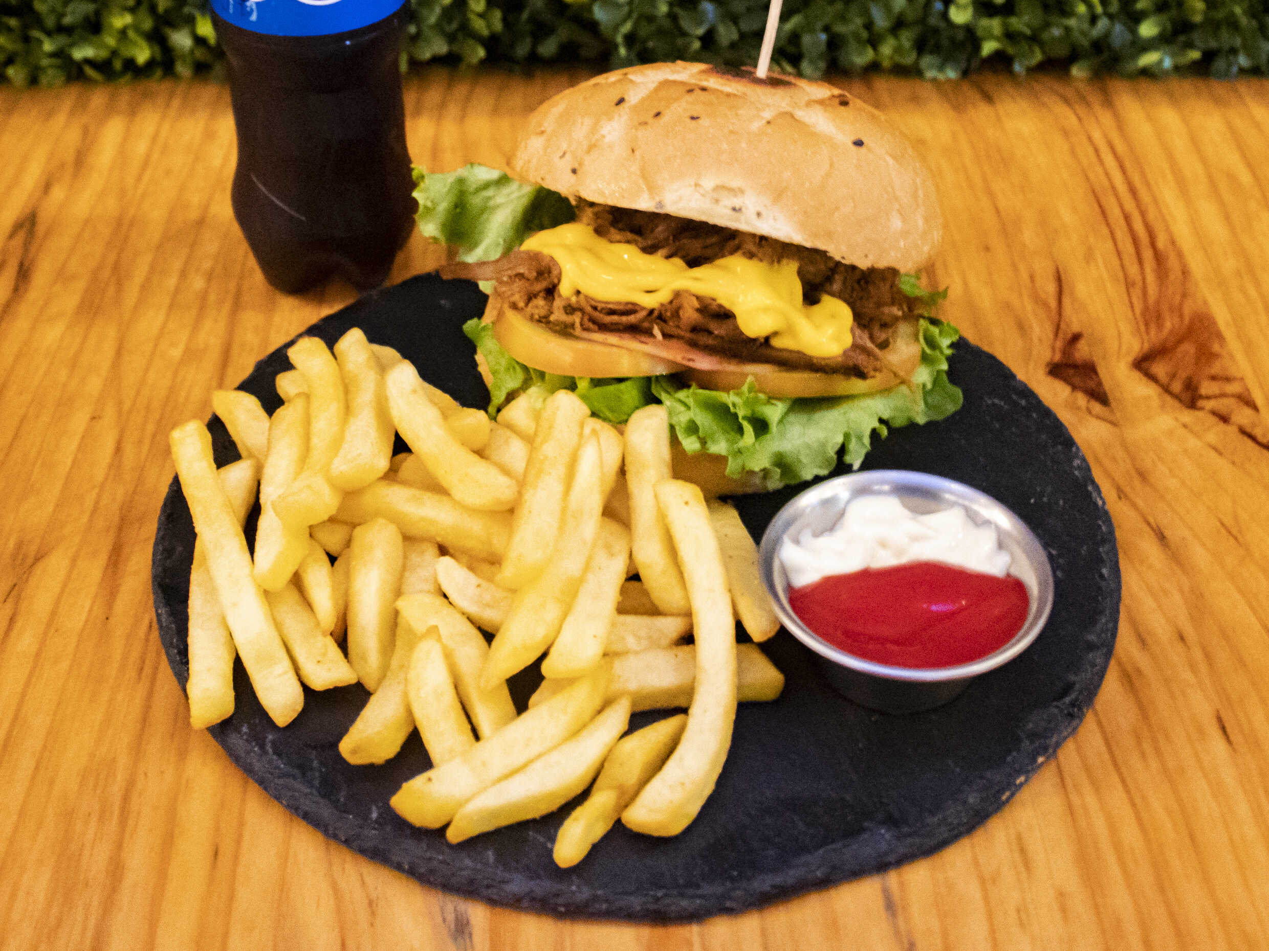 Hamburguesa mechuda (carne mechada), papas fritas y refresco a elegir.