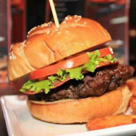 Hamburguesa de pan artesanal, torta 100% carne de res, queso cheddar derretido, jamón, lechuga, tomate, salsa de tomate y mayonesa.