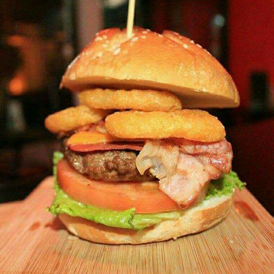 Hamburguesa de pan artesanal, torta 100% carne de res, aros de cebolla, bacón, queso cheddar derretido, jamón, lechuga, tomate, salsa barbacoa.