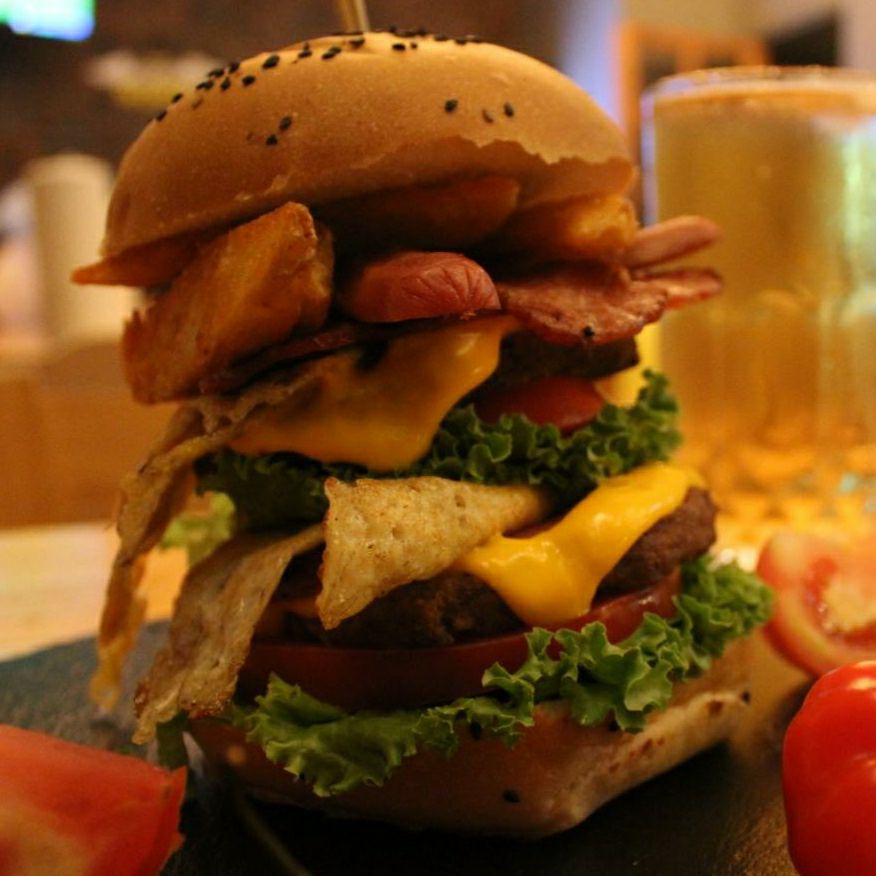 Hamburguesa gigante de pan artesanal, doble torta 100% carne de res, doble queso cheddar, doble jamón, huevo, salchicha, patatas, doble lechuga, doble tomate, salsa de tomate y mayonesa.