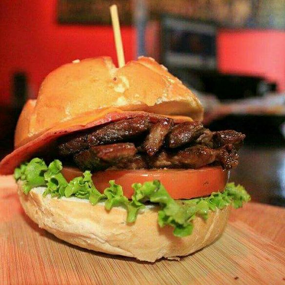 Hamburguesa de pan artesanal, 110 g de fajitas de lomo, queso cheddar derretido, jamón, lechuga, tomate, salsa de tomate y mayonesa.