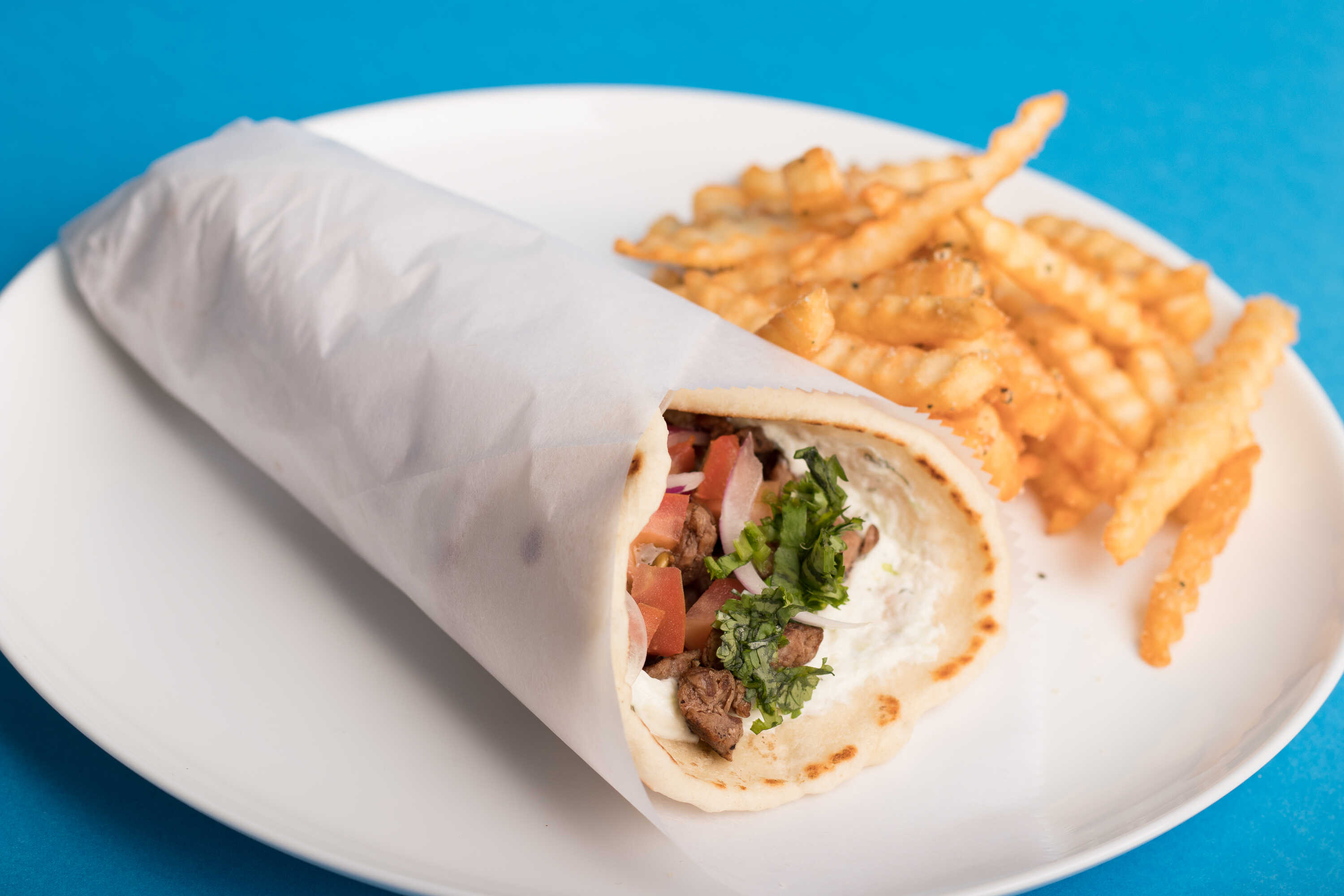 Delicioso pan pita con salsa tzatziki, carne de res en trocitos, tomate, cebolla y cilantro.