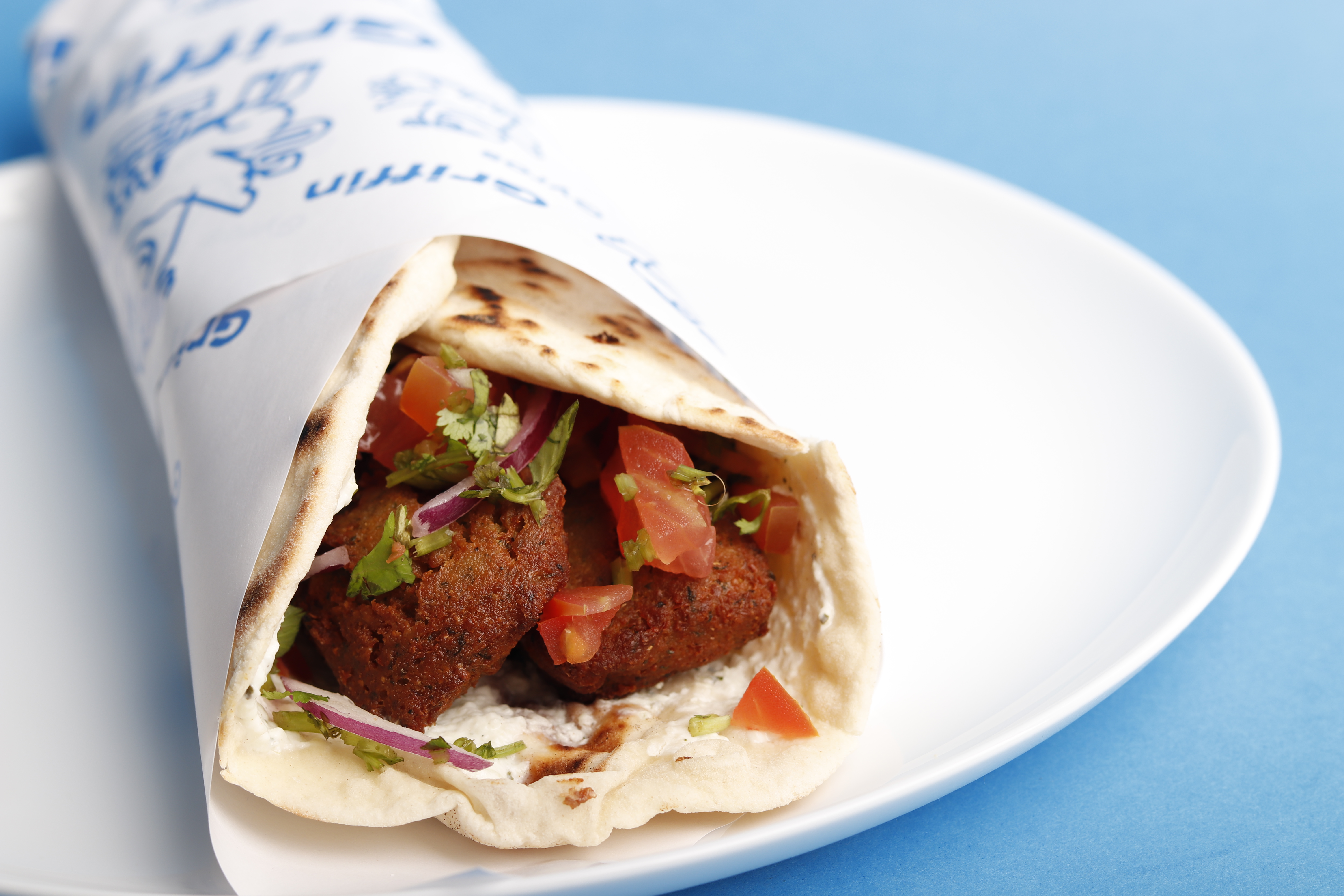 Delicioso pan pita con salsa tzatziki, falafel, tomate, cebolla y cilantro.