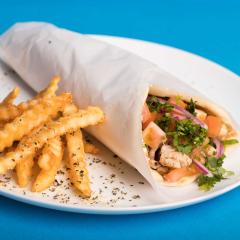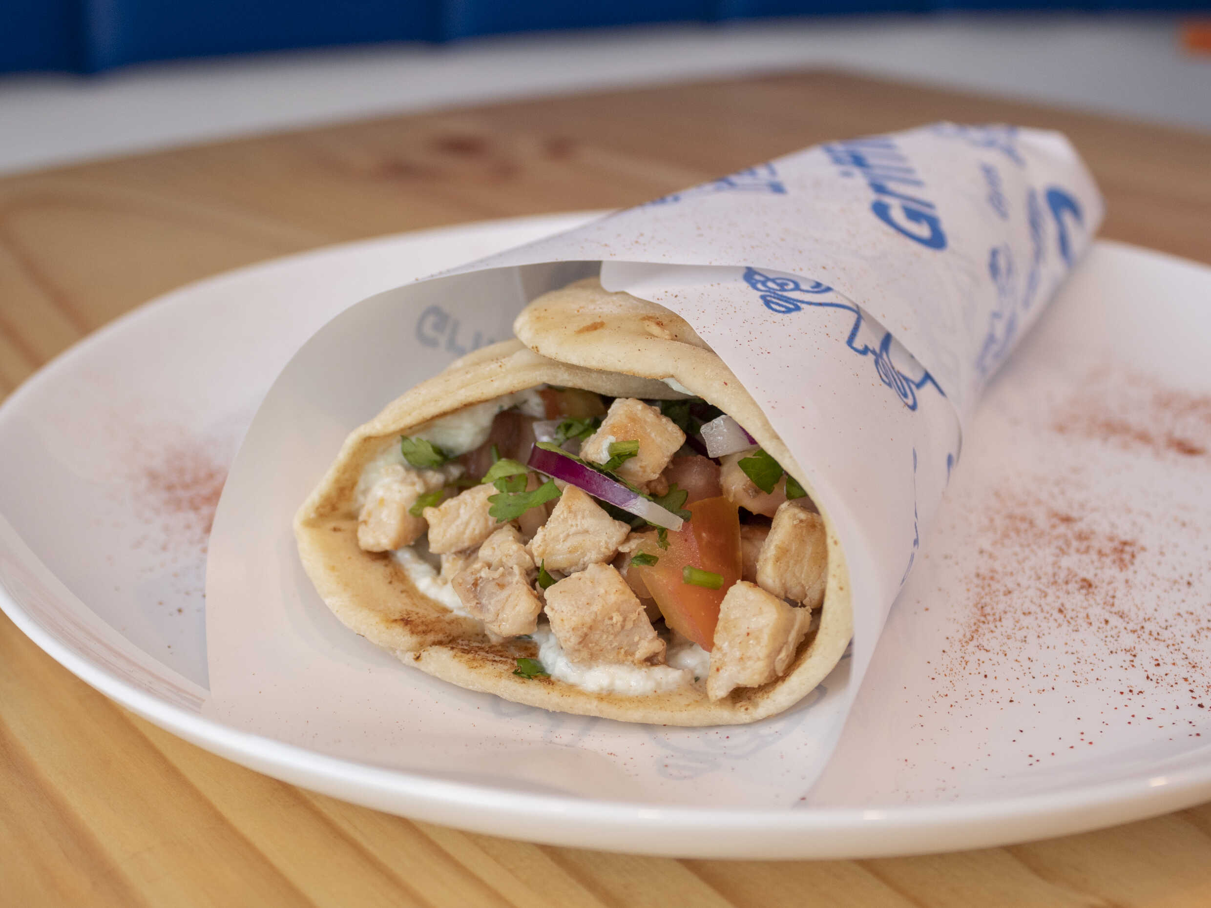 Delicioso pan pita con salsa tzatziki, pollo trocitos, tomate, cebolla y cilantro.