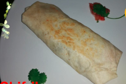 Tortilla enrollada rellena de carne con repollo, salsa de tomate y mayonesa