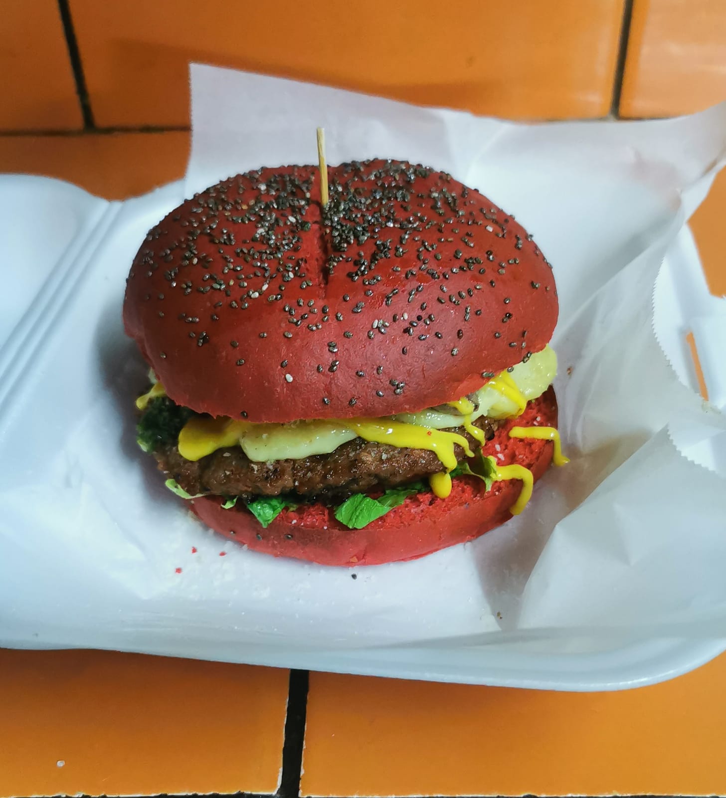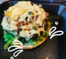 Torta de res, chorizo, queso americano, cebolla caramelizada, pesto y parmesano chipotle.