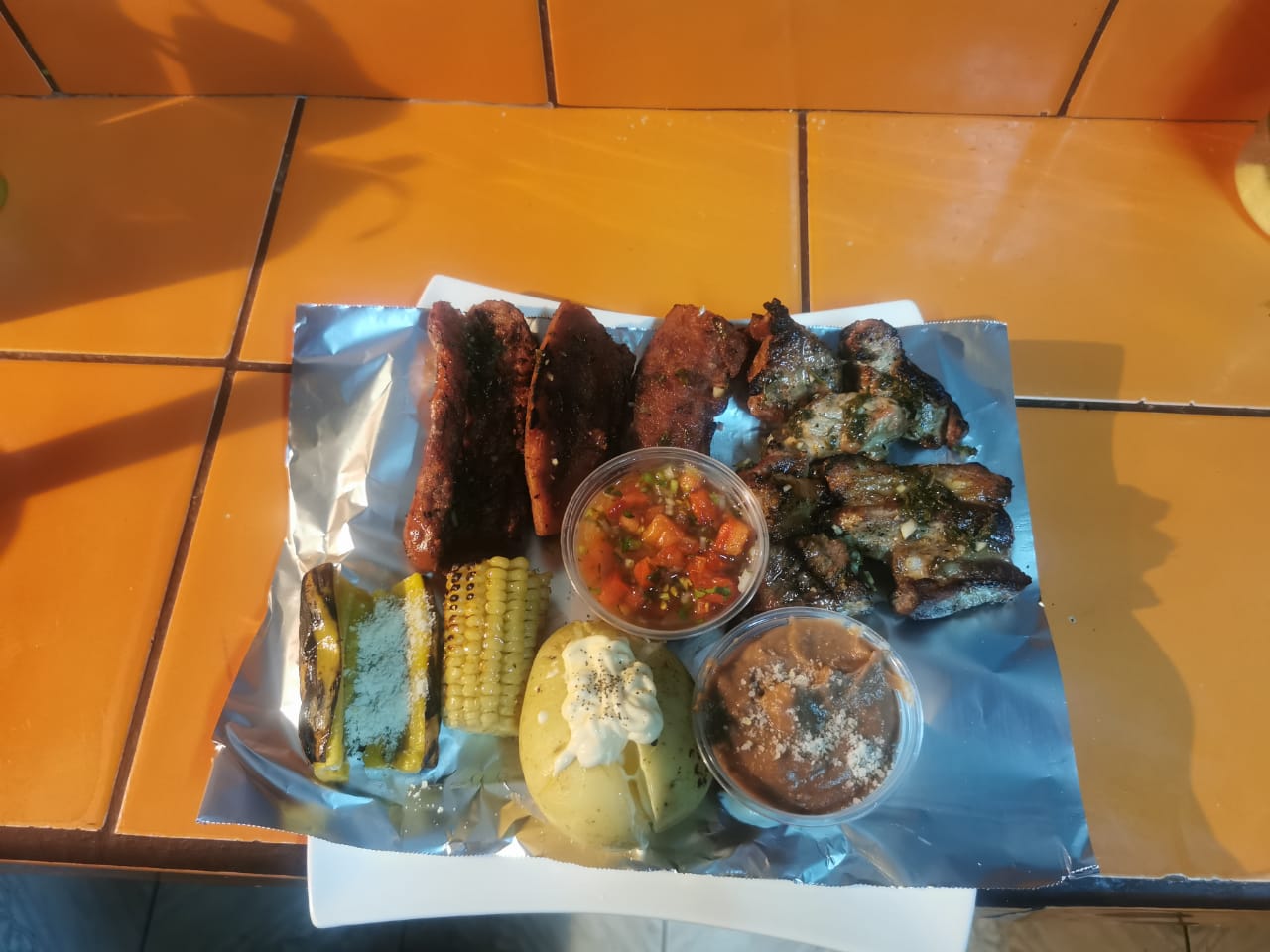 Incluye un corte de tu carne preferida, un gallo de chorizo, un gallo de salchichón, una papa asada, un elote, un plátano maduro, frijoles molidos, pico de gallo y tortillas.