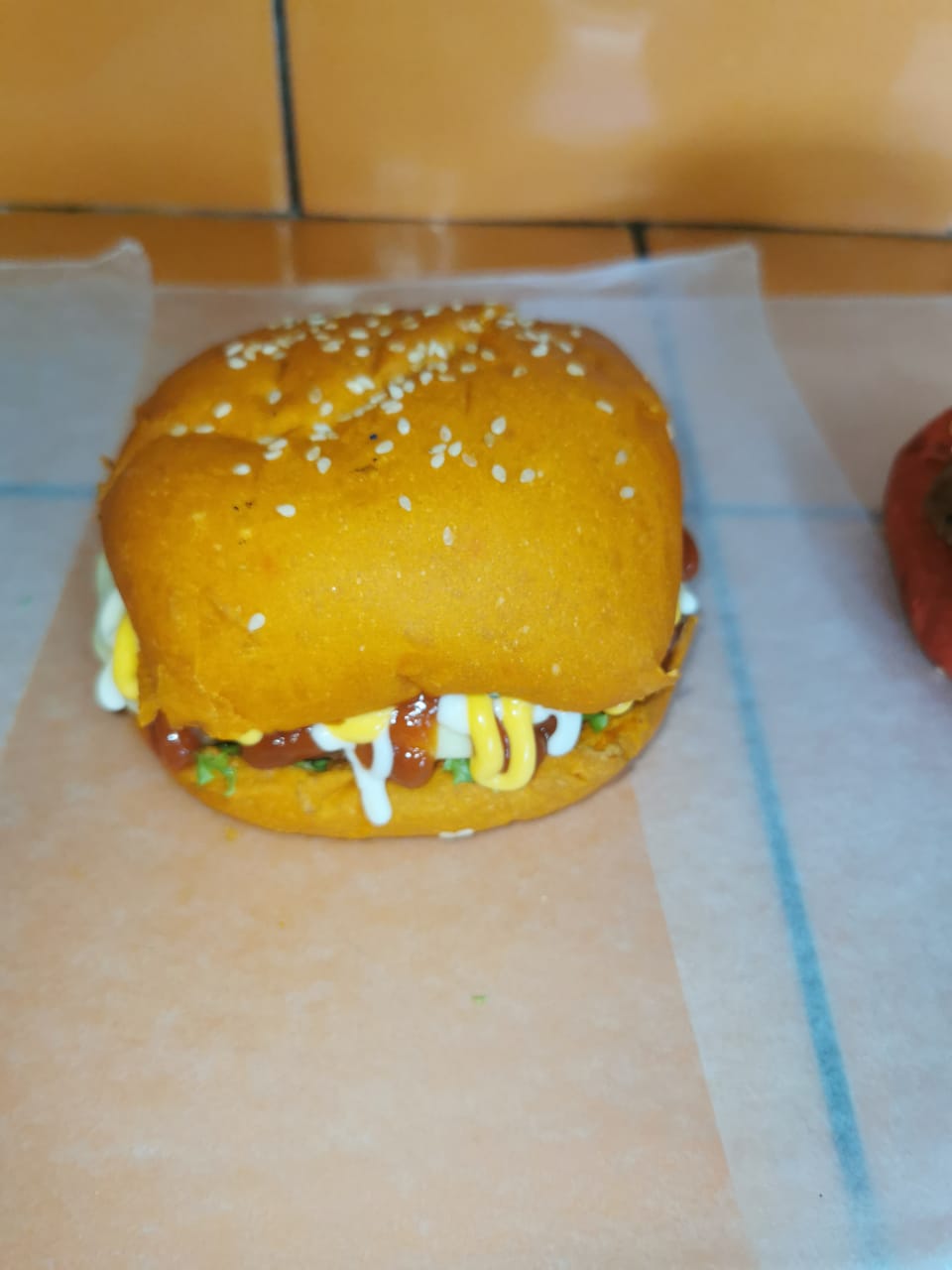 Torta de res, queso americano, tomate cebolla, salsa de tomate, mayonesa y salsa de queso.