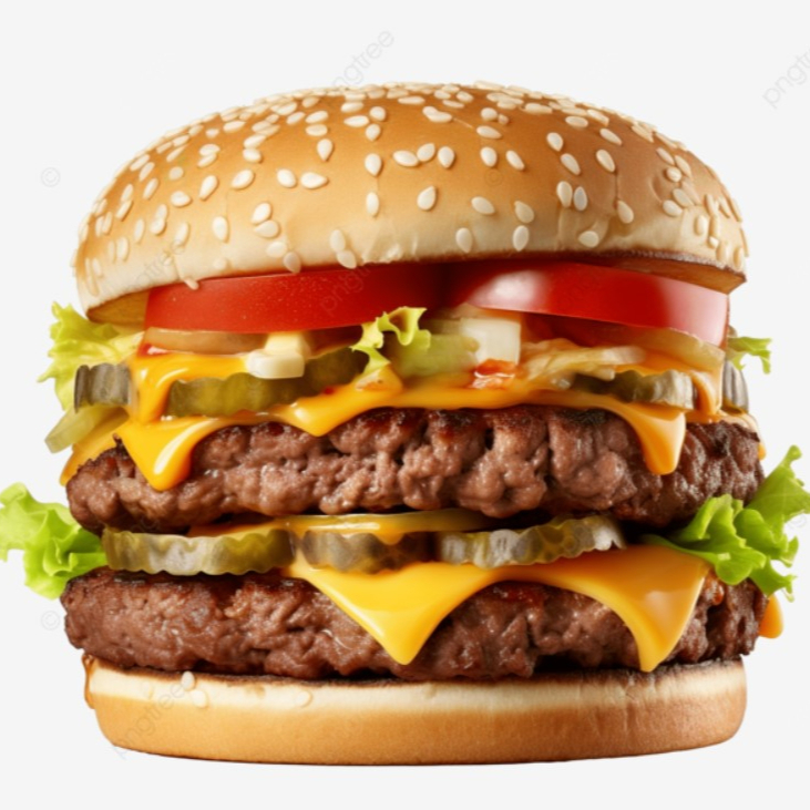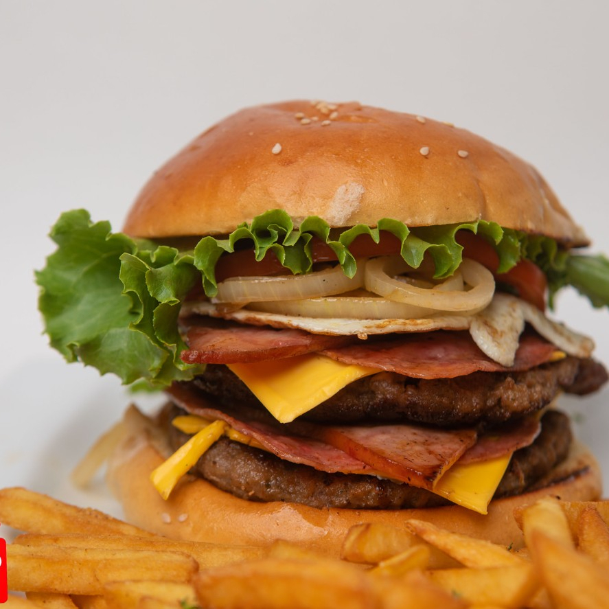 Hamburguesa con doble torta de carne de res especial de la casa, queso, jamón, lechuga, tomate
