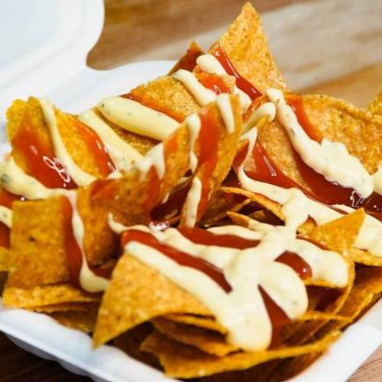 Tortillas fritas con carne, salsa de queso, pico de gallo, lechuga, mayonesa casera.