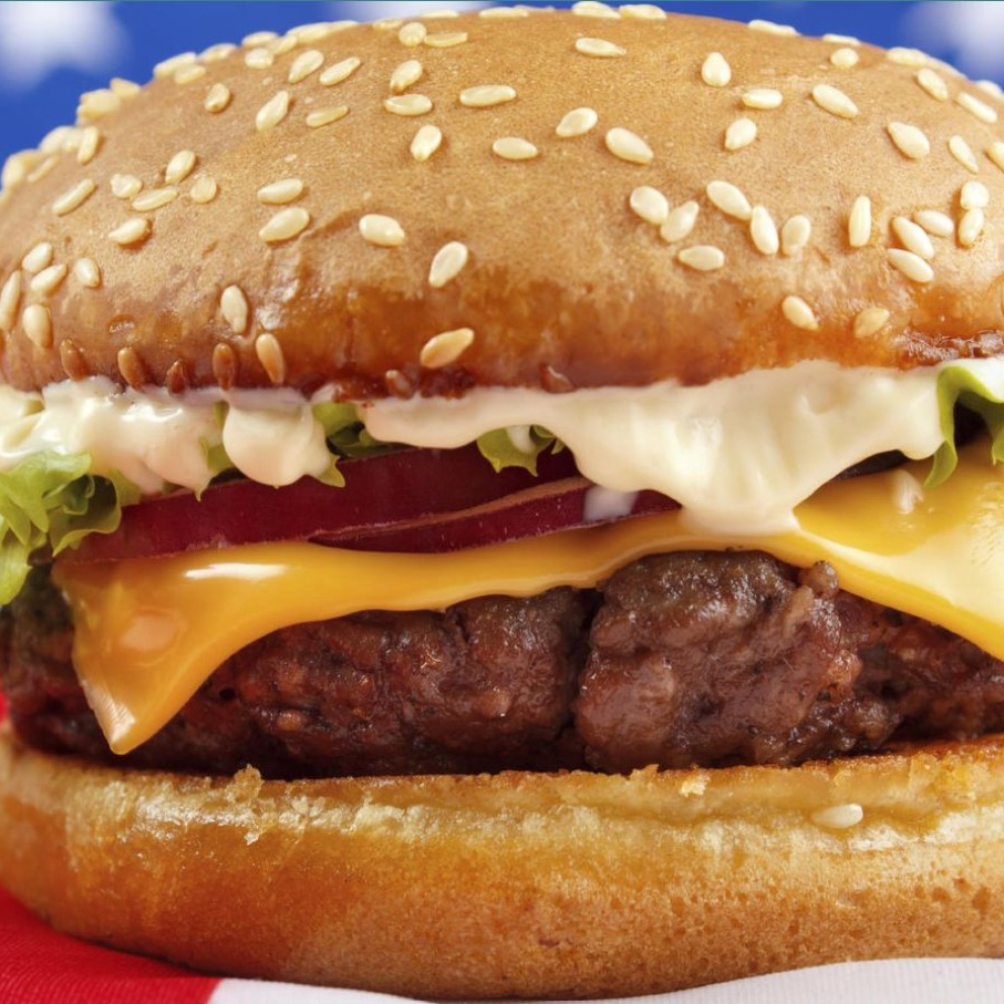 Hamburguesa con una torta de carne de res, jamón y queso.