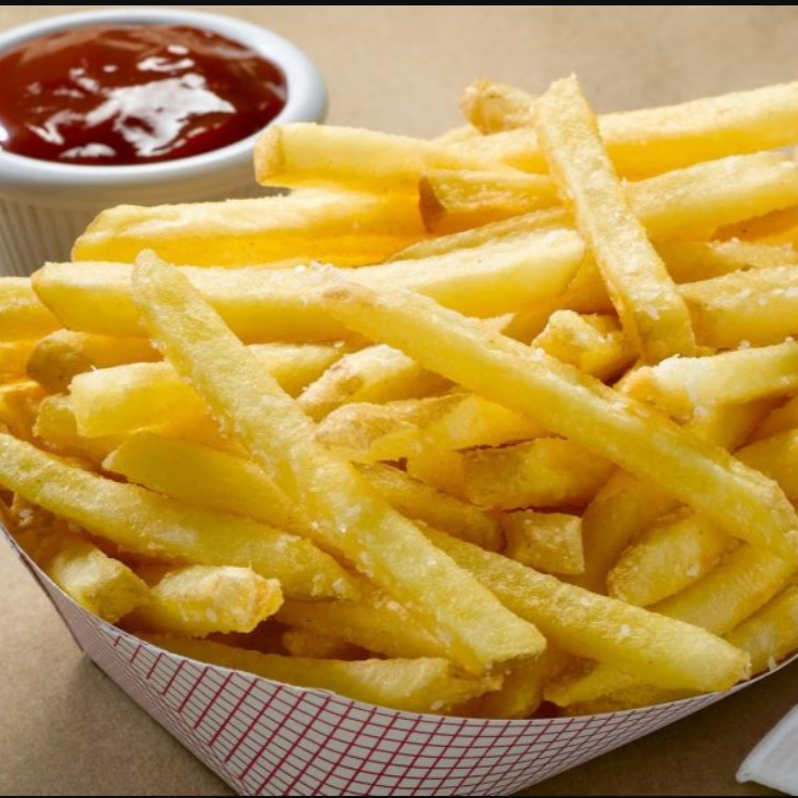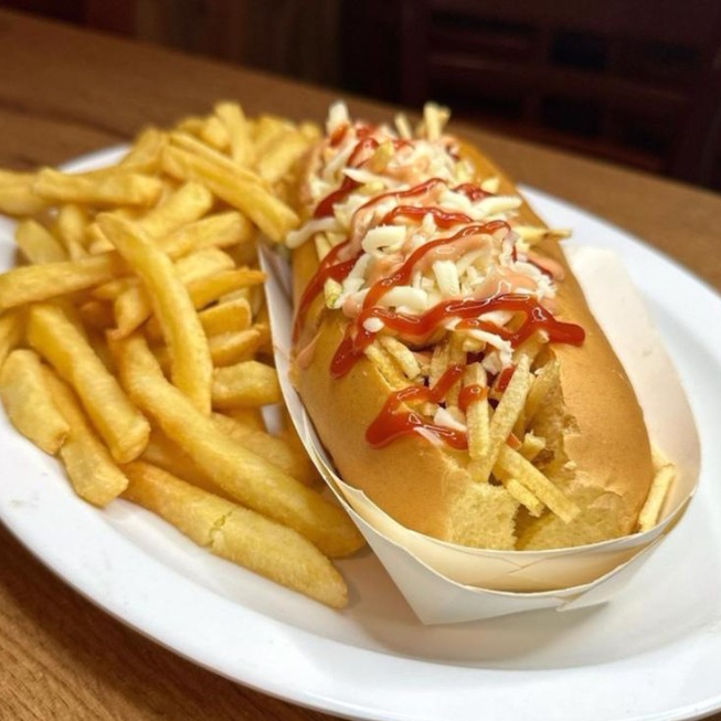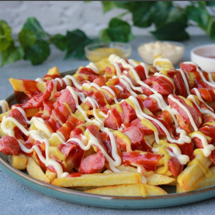 Trozos de salchicha y papas fritas con salsa de tomate y mayonesa casera.