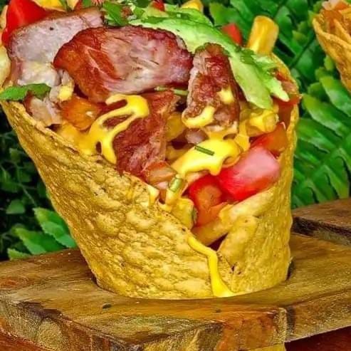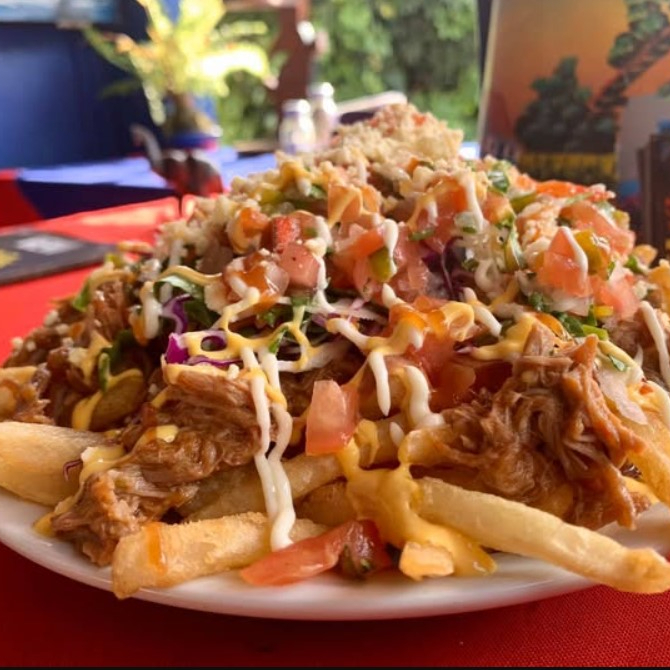 Papas fritas con carne, salsa de queso, pico de gallo, lechuga, salsa de tomate y mayonesa casera.