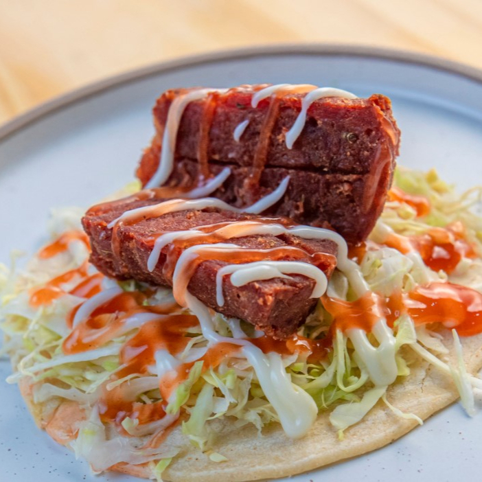 Tortilla de maíz con carne mechada de res , repollo y mayonesa casera.