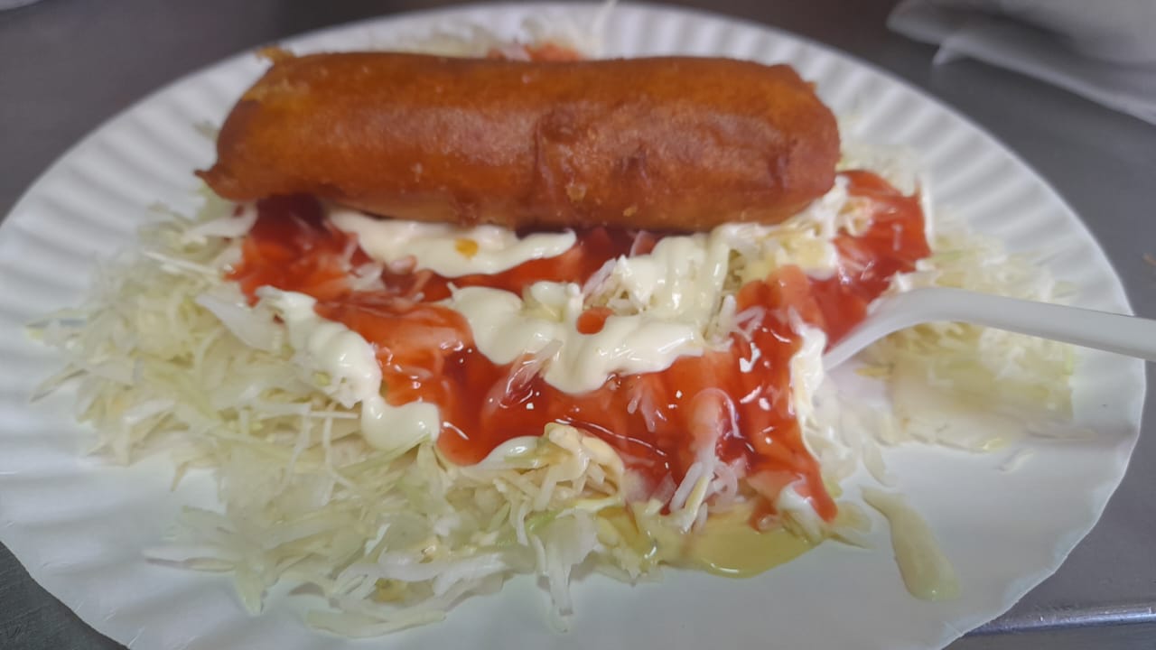 Relleno de carne desmechada, acompañado de repollo, salsa de tomate y mayonesa.