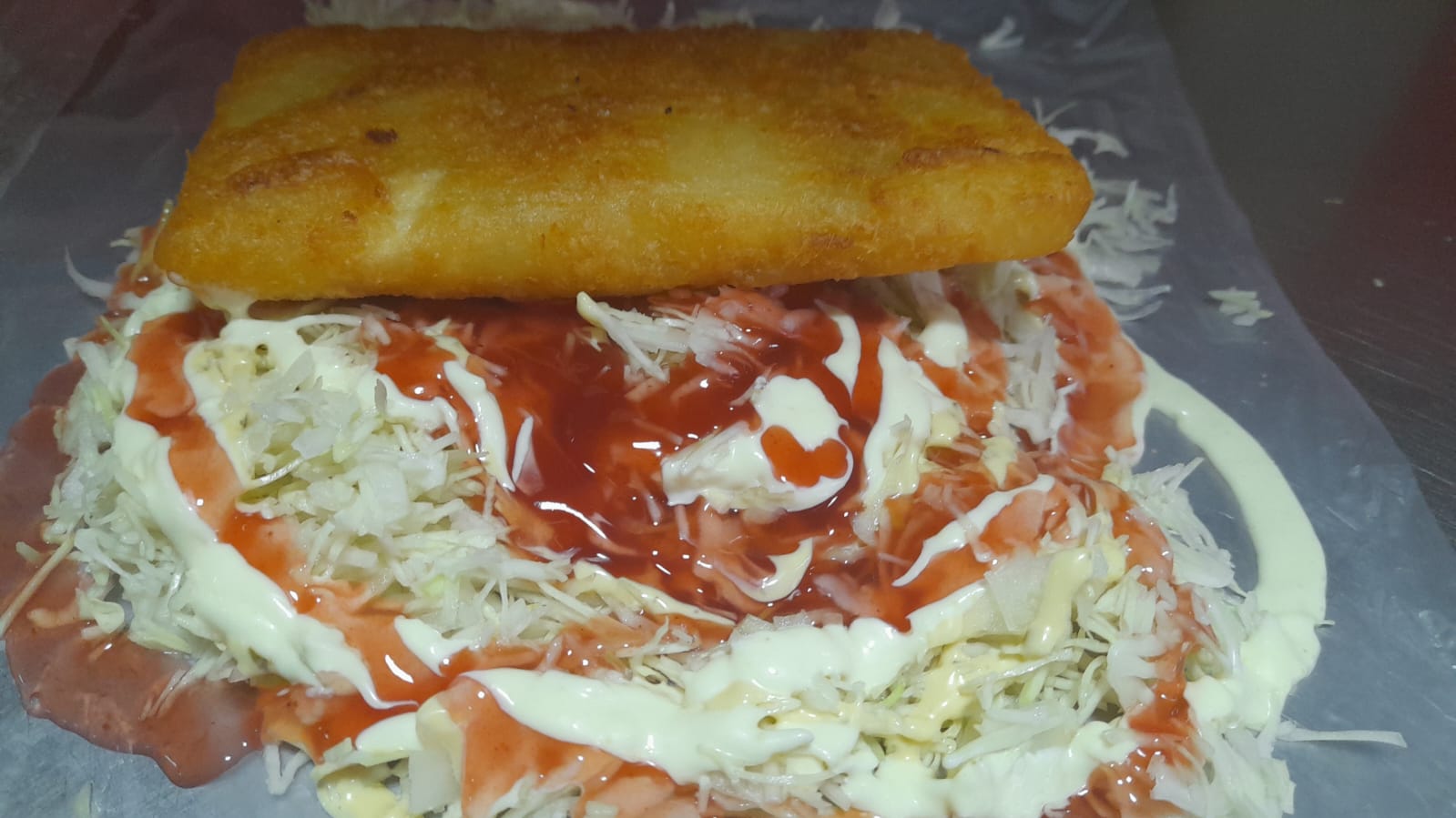 Carne, repollo con salsa de tomate y mayonesa.