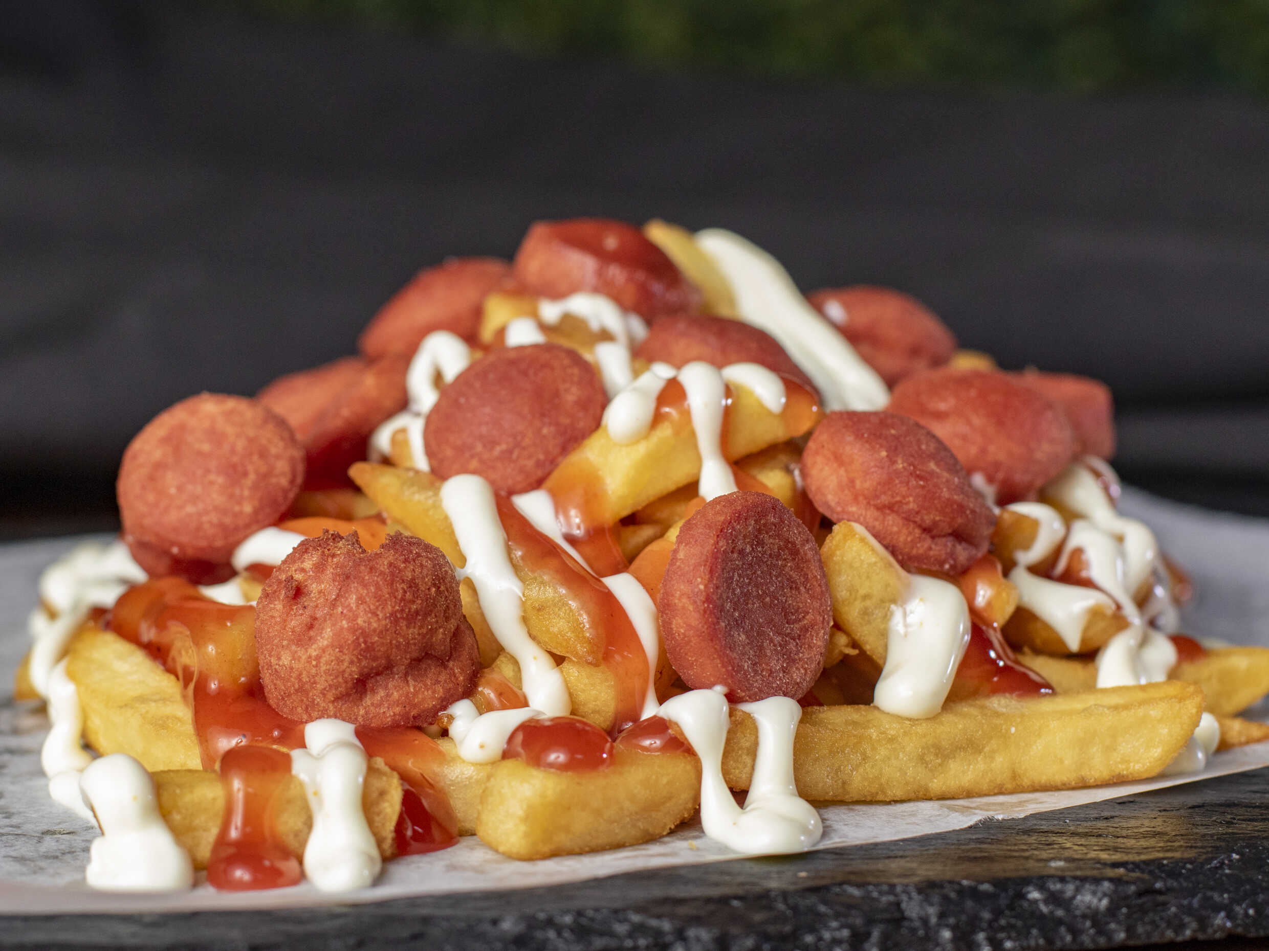 170gr de papas fritas, una salchicha, y salsa de tomate y mayonesa