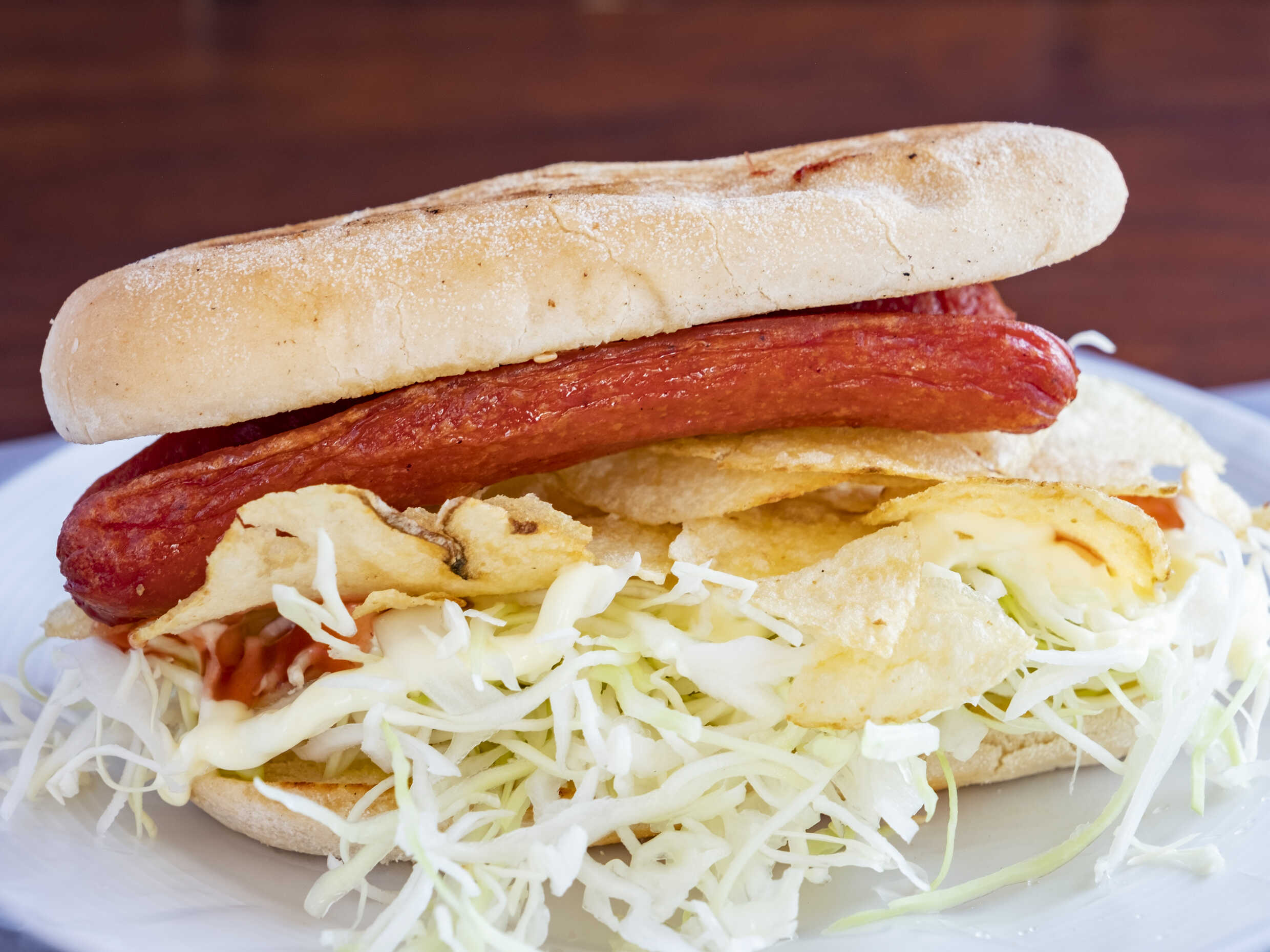Disfruta de nuestro delicioso hot dog con salchicha jugosa, acompañado de repollo fresco y nuestras salsas caseras. Servido con papas tostadas crujientes a un lado, este clásico te ofrecerá una combinación de sabores y texturas que no podrás resistir. ¡Perfecto para cualquier momento!