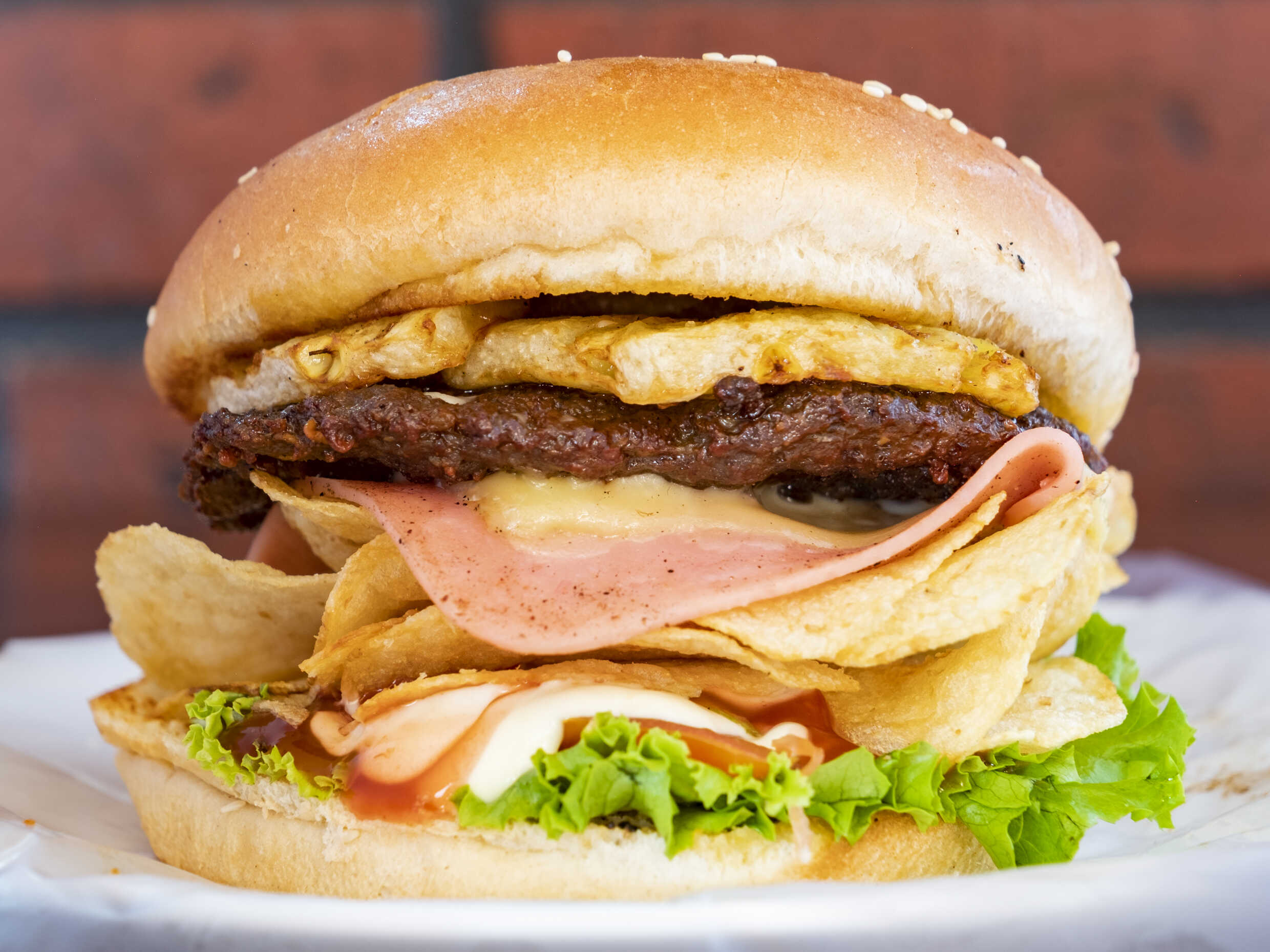 Jugosa torta de carne de res tiquiqueña de 120g con queso mozzarella derretido, jamón y una deliciosa rodaja de piña para un toque dulce y refrescante. Lechuga fresca, tomate, mayonesa especial de la casa y un toque de ketchup en un pan suave con ajonjolí y crujientes tostadas (chips). ¡El sabor dulce y salado perfecto que llega hasta tu puerta para que disfrutes cada bocado!