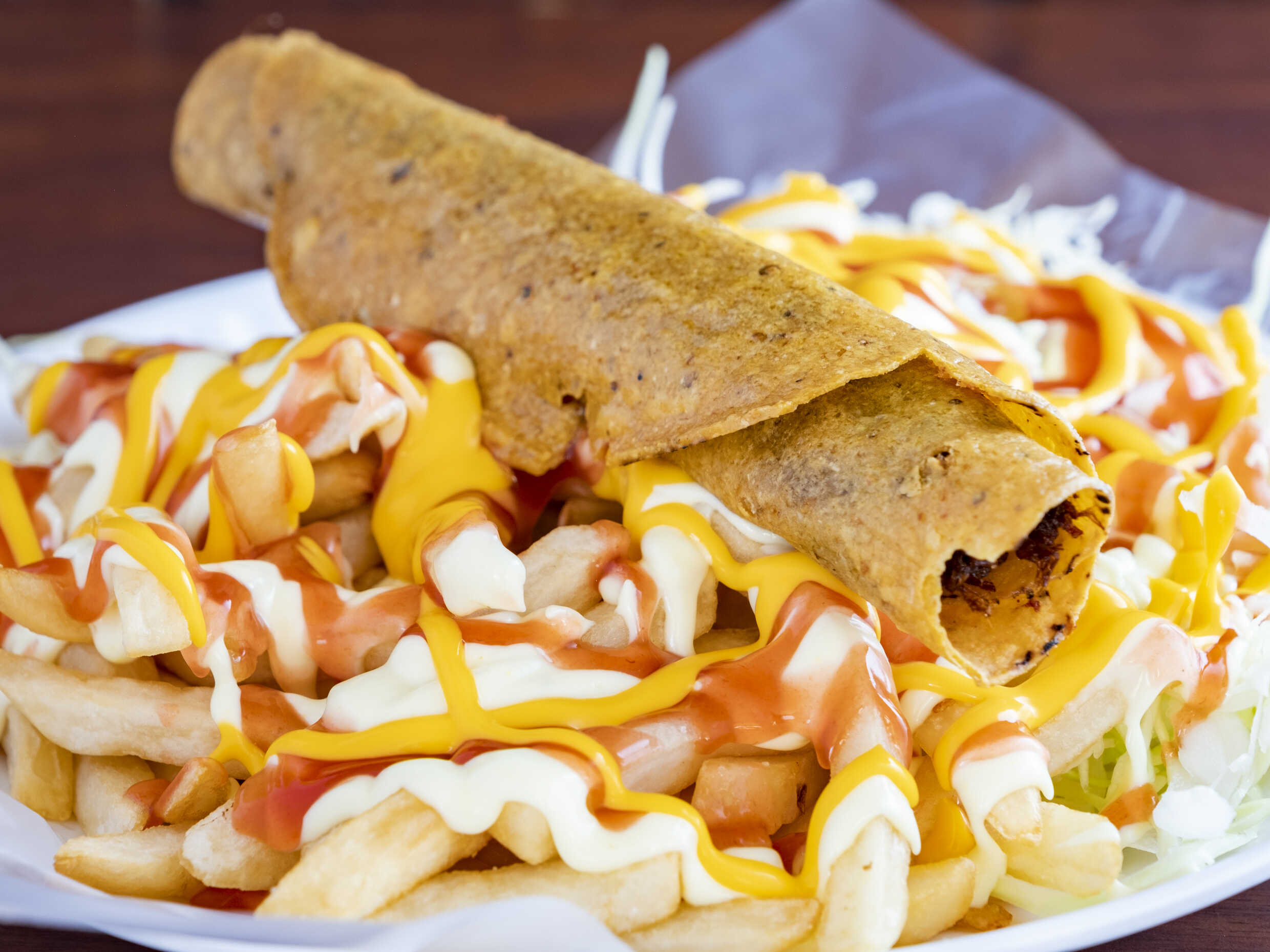 Disfruta de nuestro taco de tortilla de harina, relleno de jugosa carne mechada y queso mozzarella, acompañado de repollo fresco y nuestras salsas caseras. Este delicioso taco viene con papas a la francesa y una rica salsa de queso cheddar, creando una combinación perfecta que hará que cada bocado sea inolvidable. ¡Una experiencia única para los amantes del buen comer!