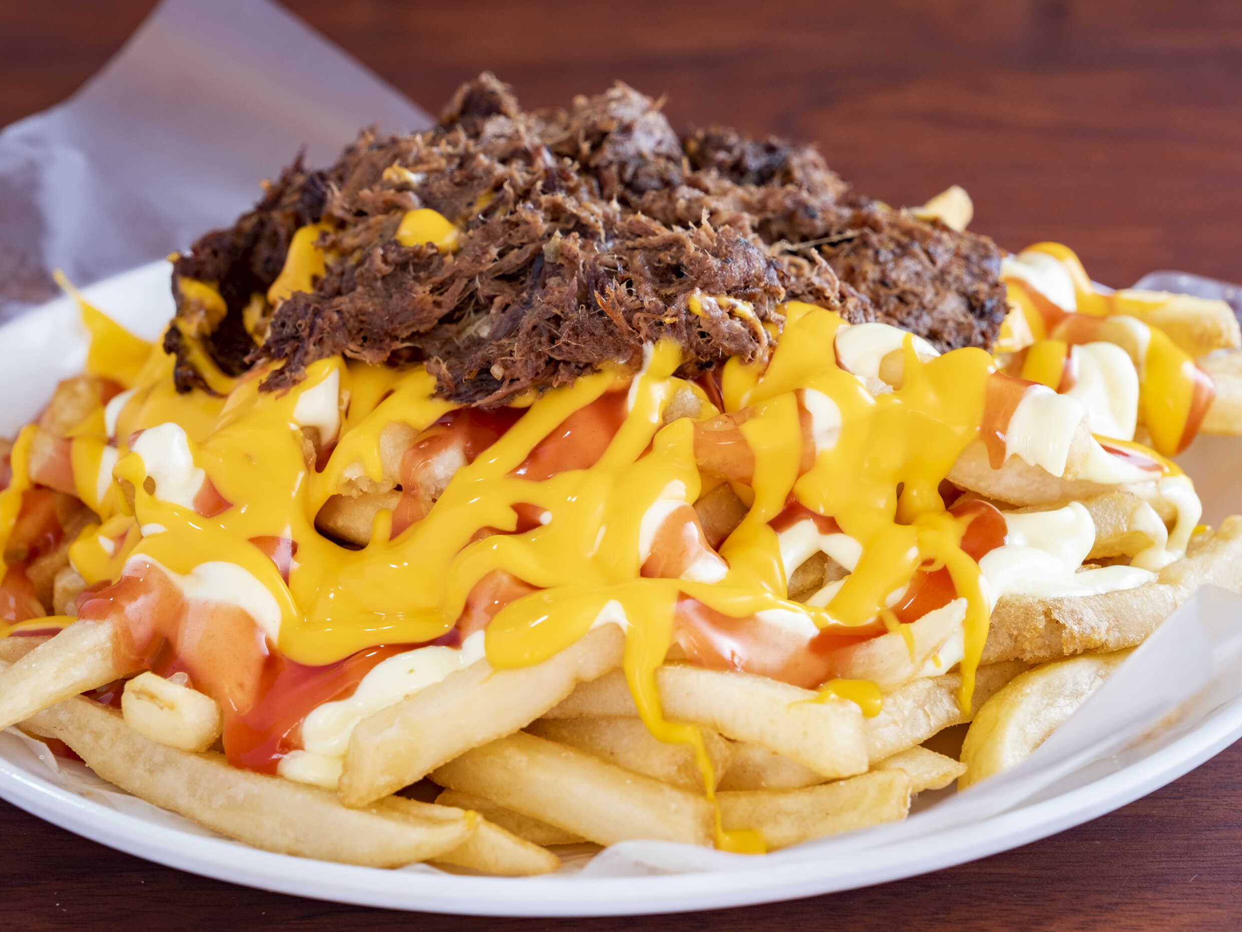 ¡Sabores y texturas en cada bocado! Papas fritas crujientes con 150g de carne mechada de res tiquiqueña, bañadas en salsa de queso cheddar derretido. Un toque de nuestra mayonesa especial de la casa y ketchup. ¡Perfecto para los amantes de la carne y papas!