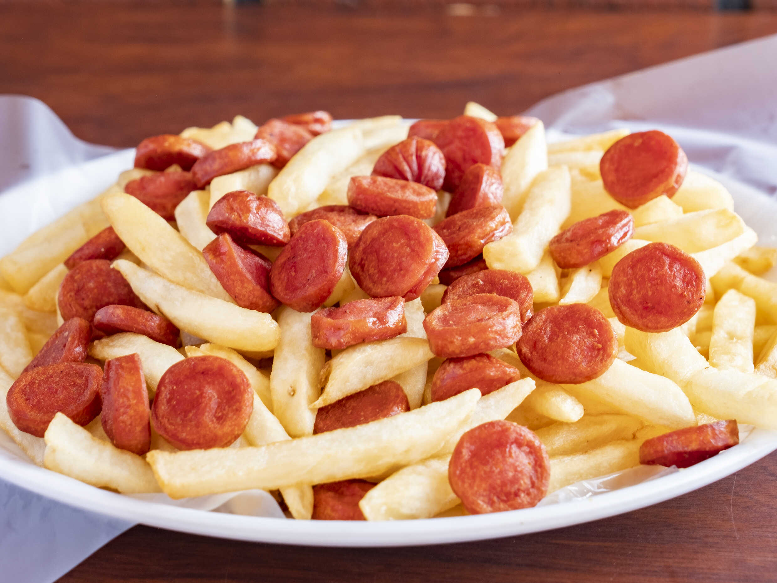 Papas a la francesa doradas y crujientes con rodajas de salchichas. Acompañadas de nuestra mayonesa especial de la casa y ketchup ligeramente especiado. ¡Un clásico irresistible!