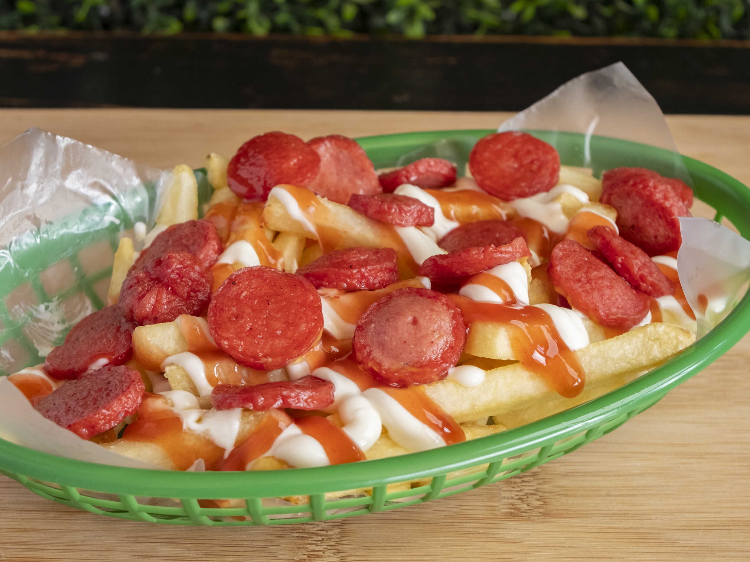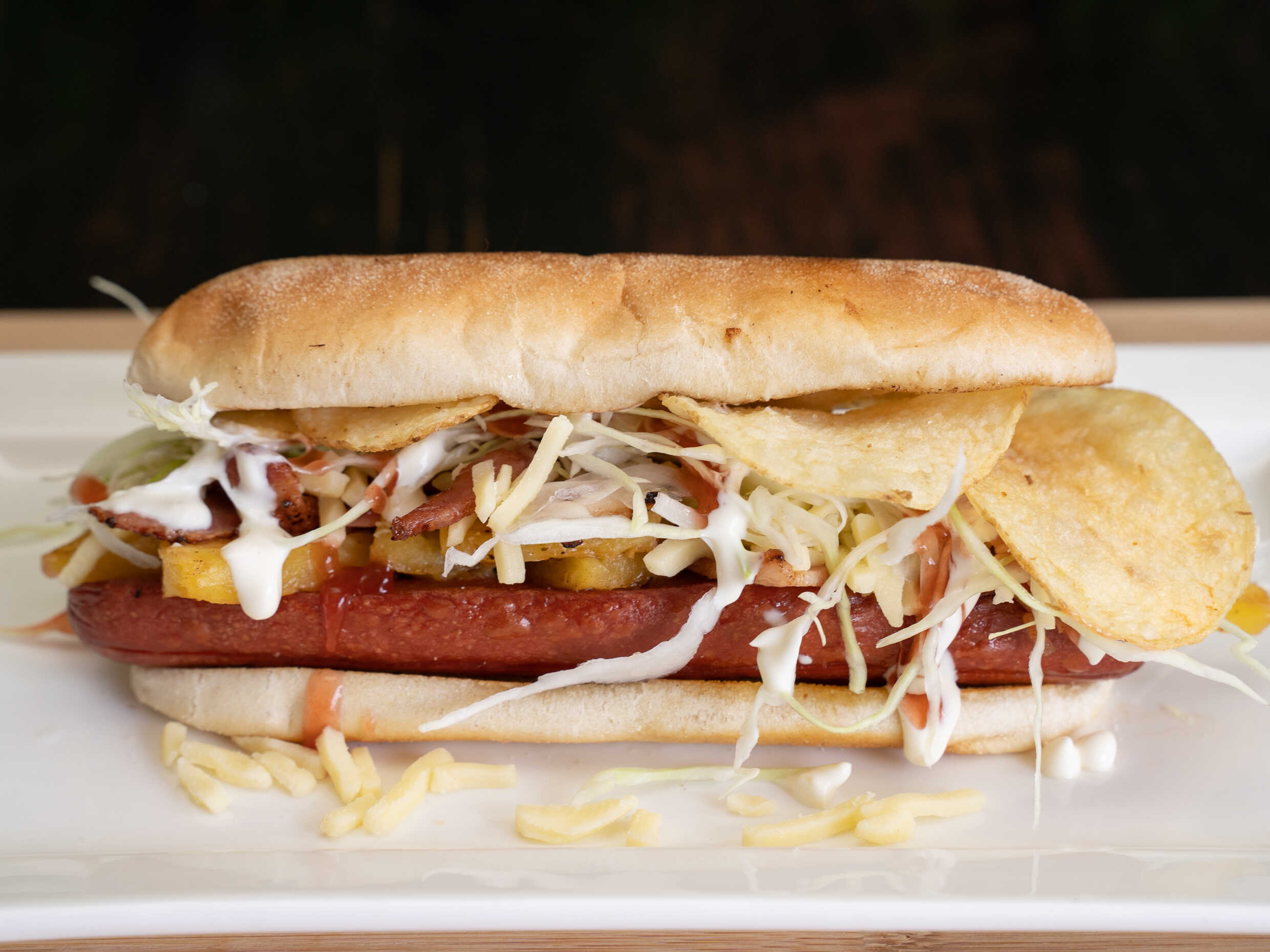 Salchicha, repollo, piña, queso mozzarella, tocineta, salsas, y papas tostadas.