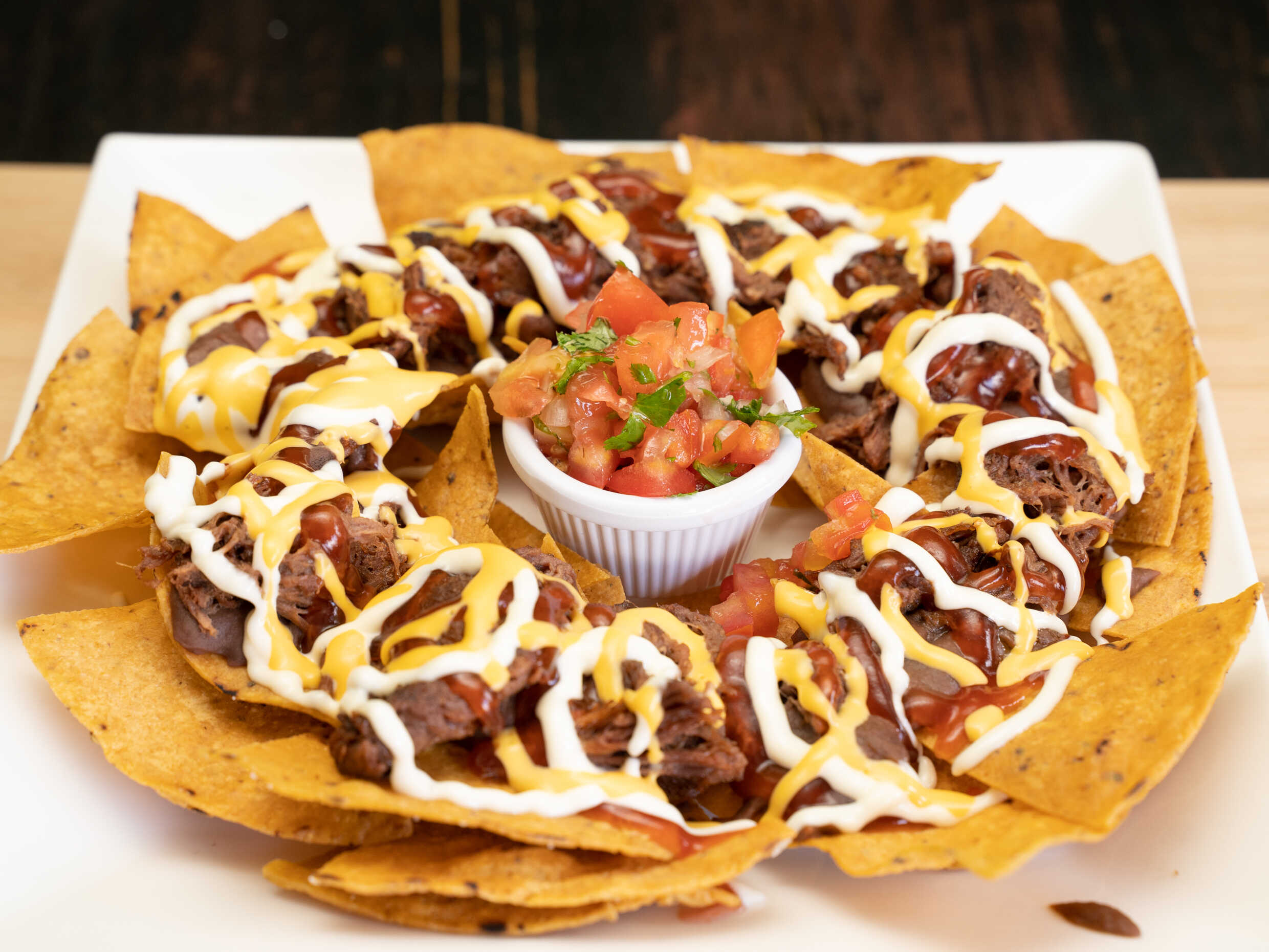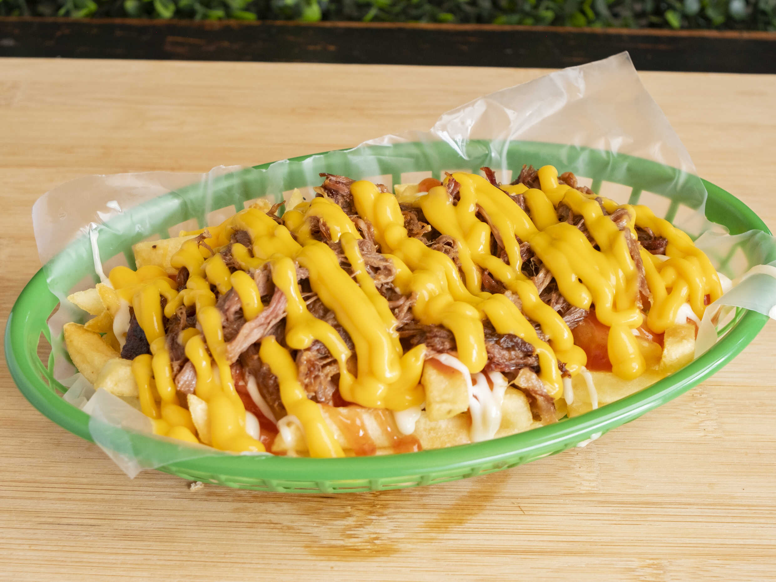 Cama de carne mechada sobre una porción de papas fritas, queso cheddar y salsasCama de carne mechada, sobre una porción de papas fritas, queso cheddar y salsas.