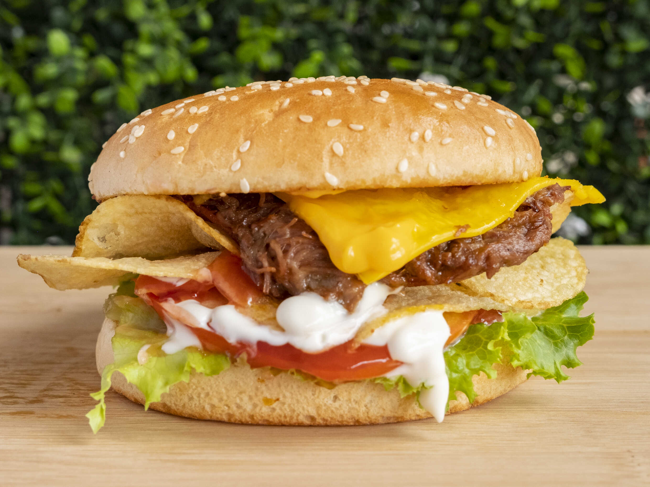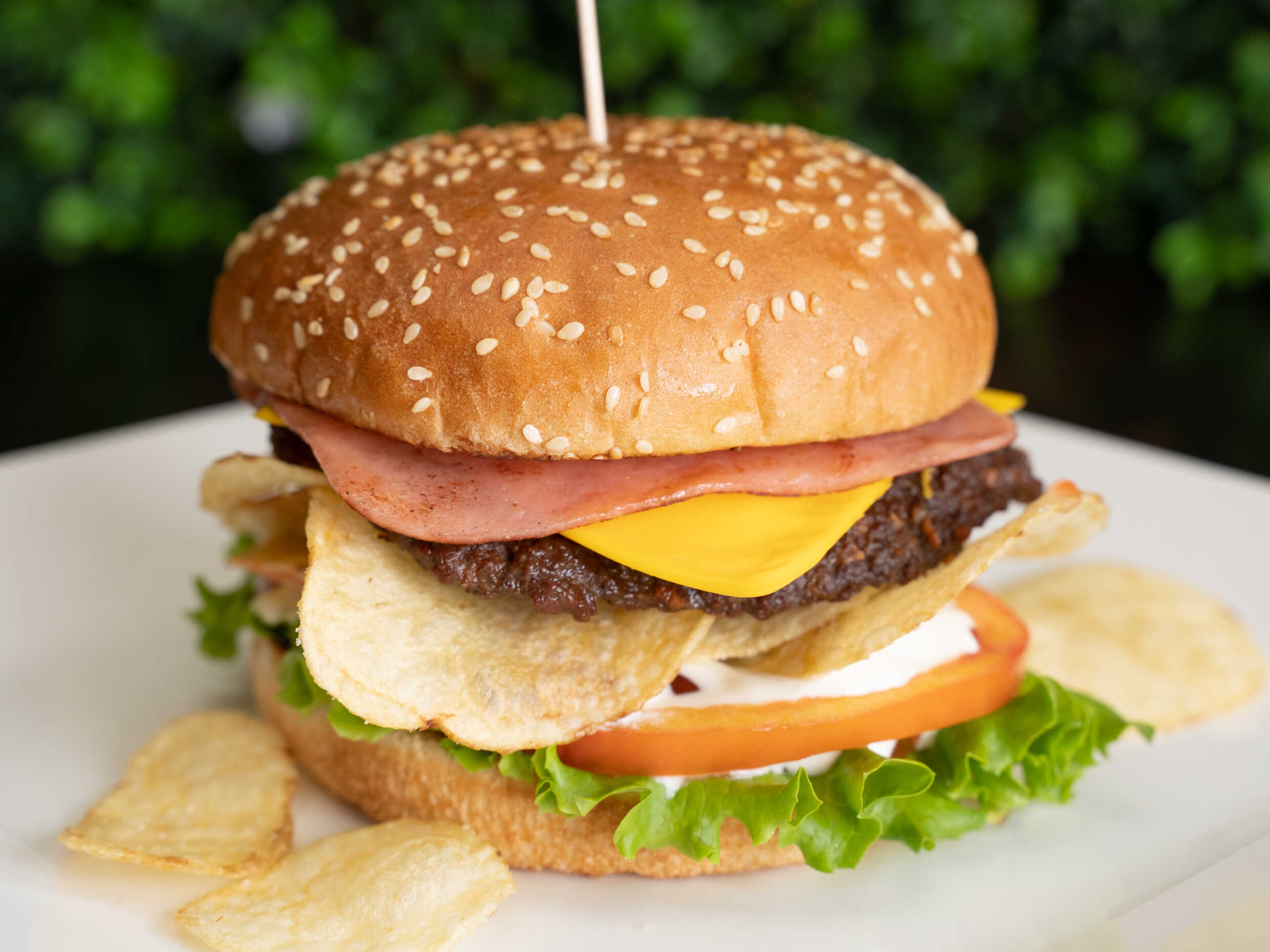 Torta de carne, jamón, queso amarillo, papas tostadas, salsas, lechuga y tomate.