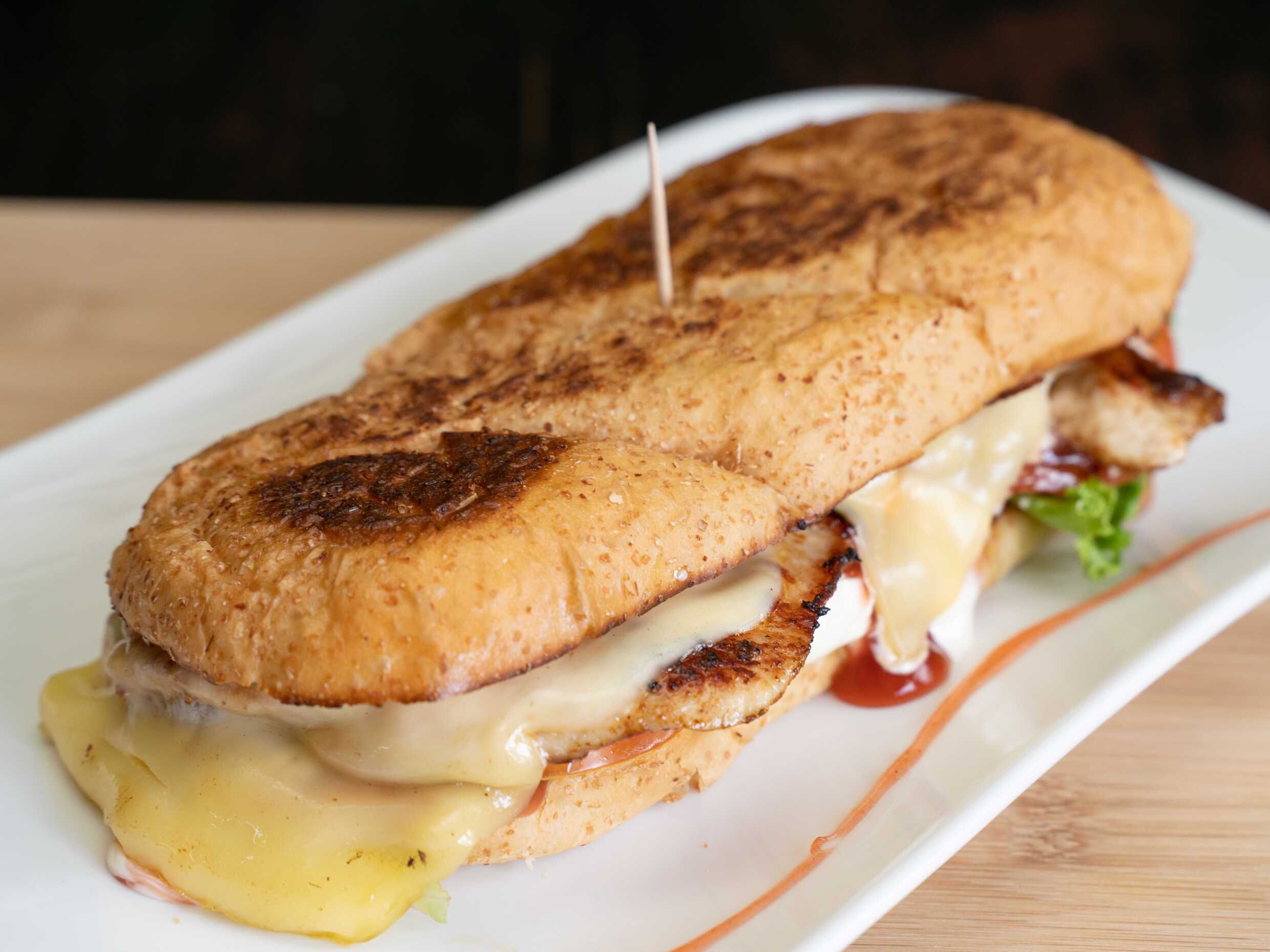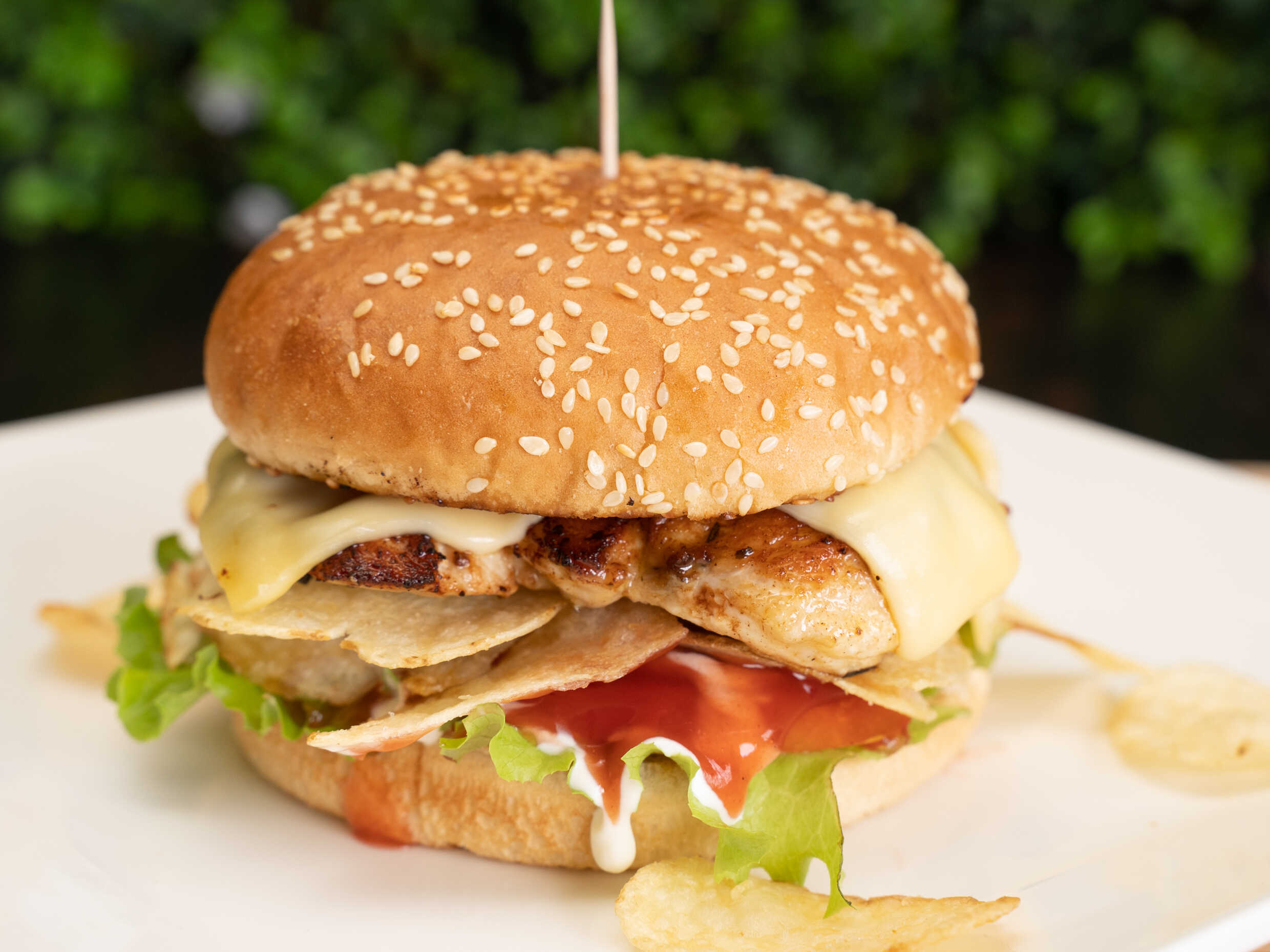 Filete de pollo a la plancha, queso mozarella,tocineta,papas tostadas, salsas, lechuga y tomate.