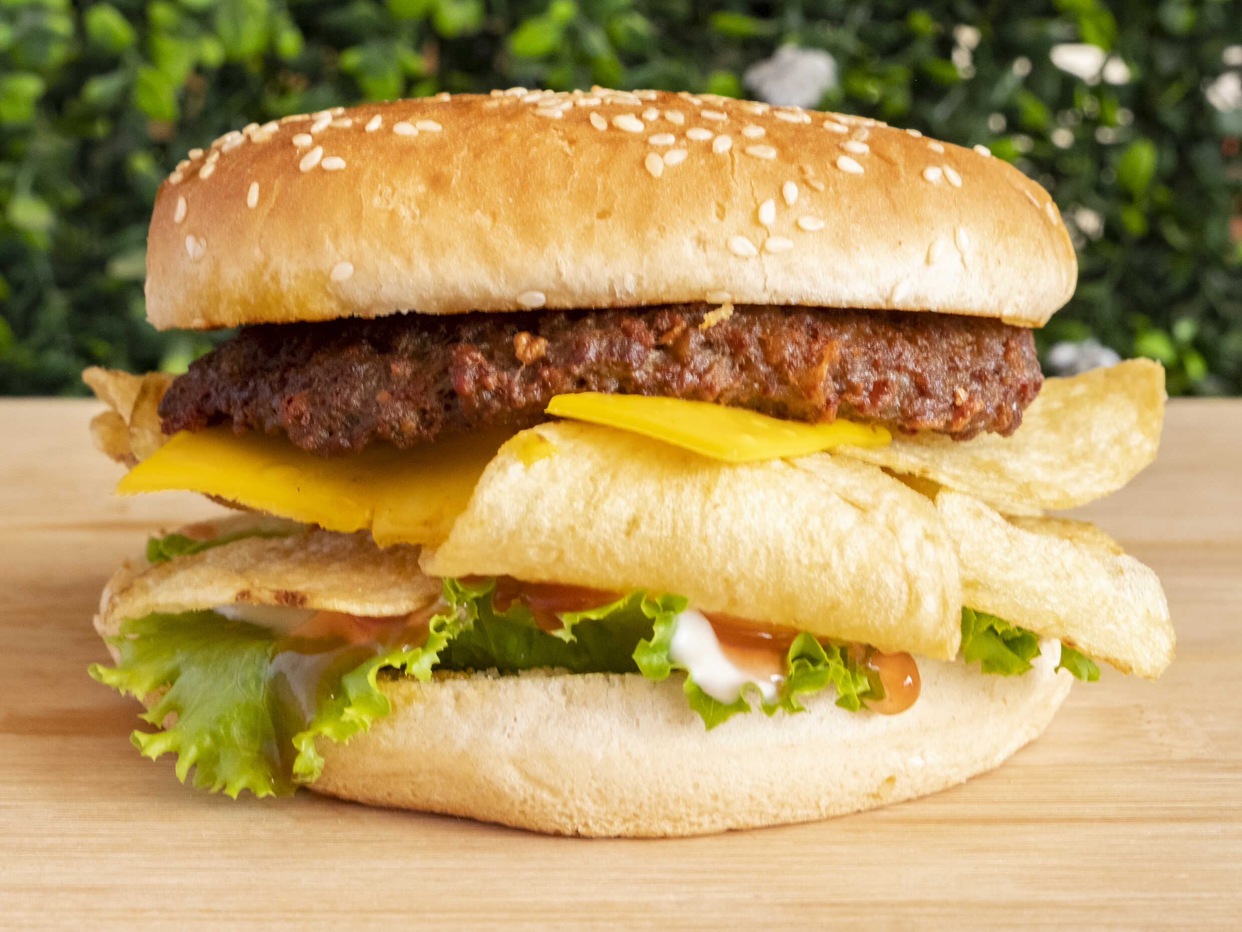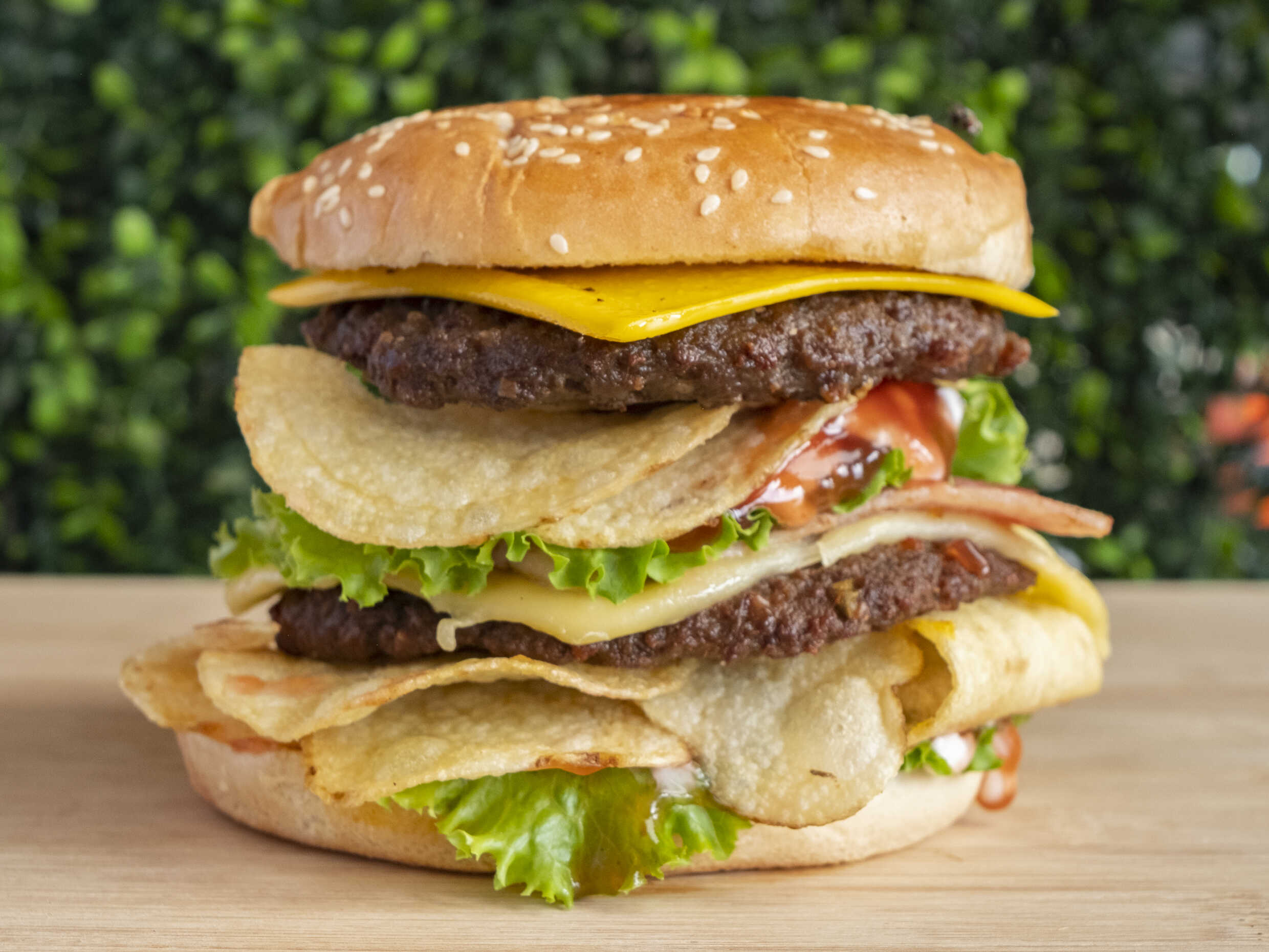Doble torta de carne, tocineta, queso amarillo, queso mozzarella, papas tostadas, salsas, lechuga y tomate-