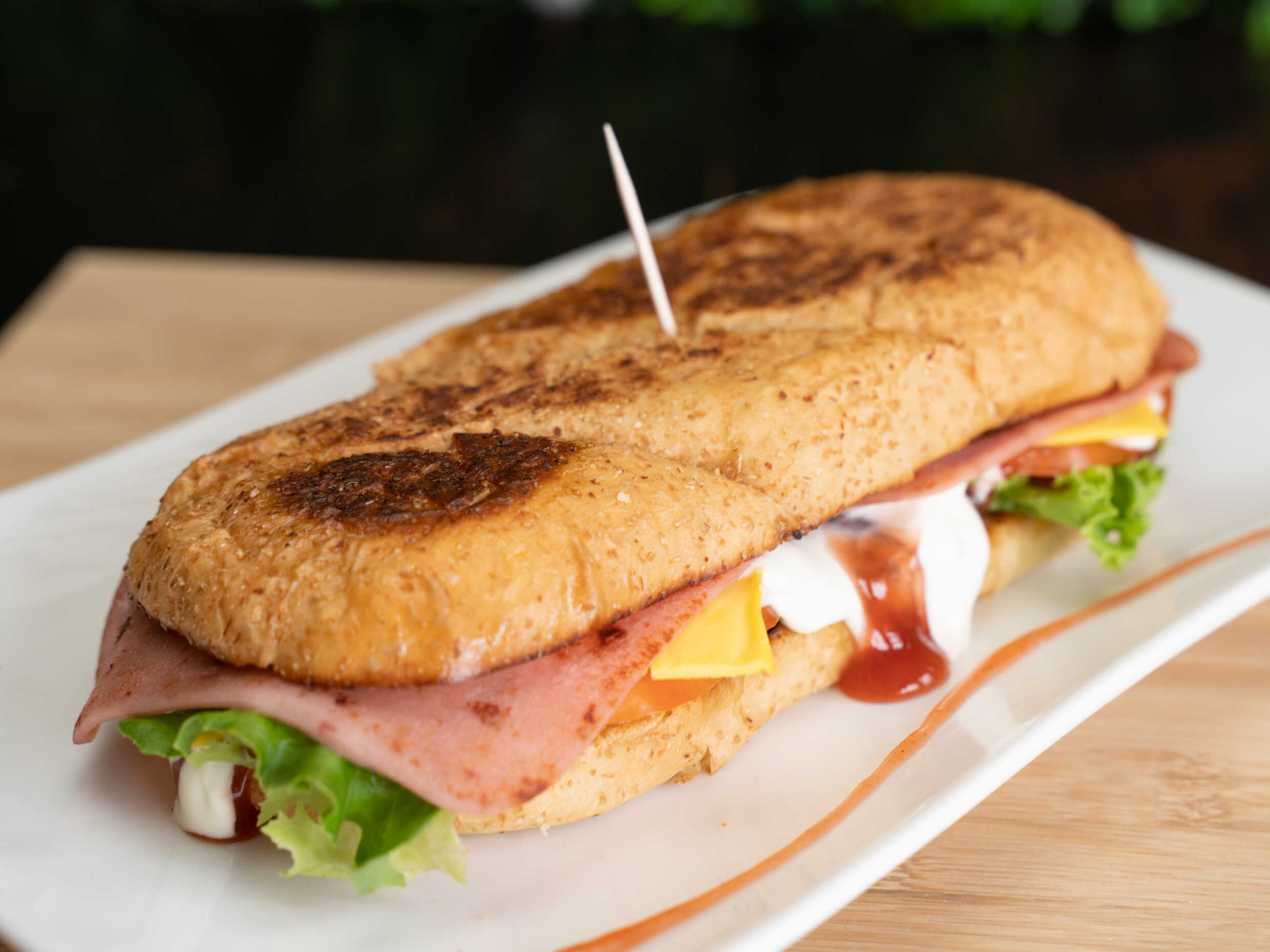 Jamón, queso amarillo, salsas, lechuga y tomate.