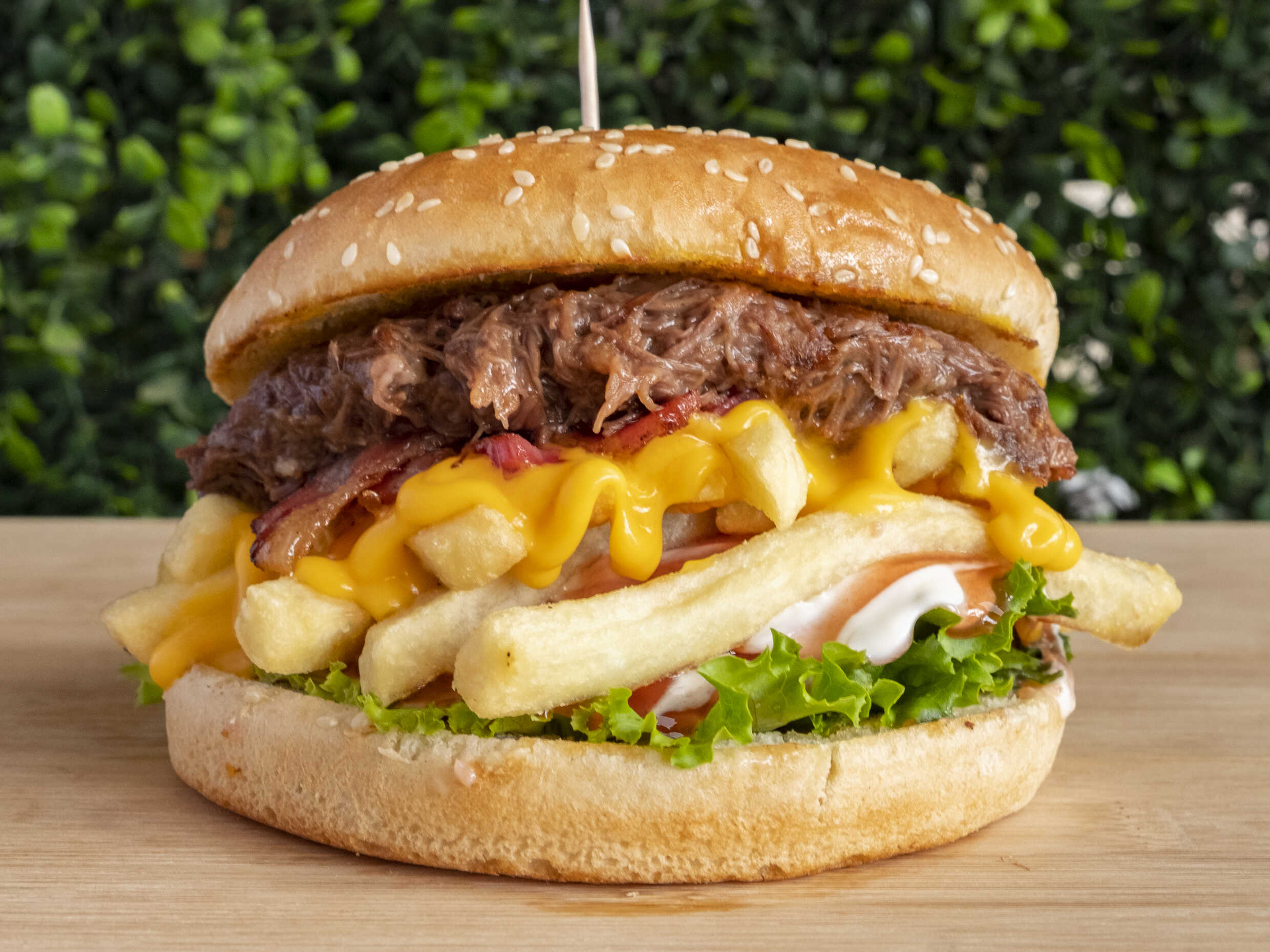 Carne mechada, queso chedar, papas a la francesa, salsas, lechuga y tomate.