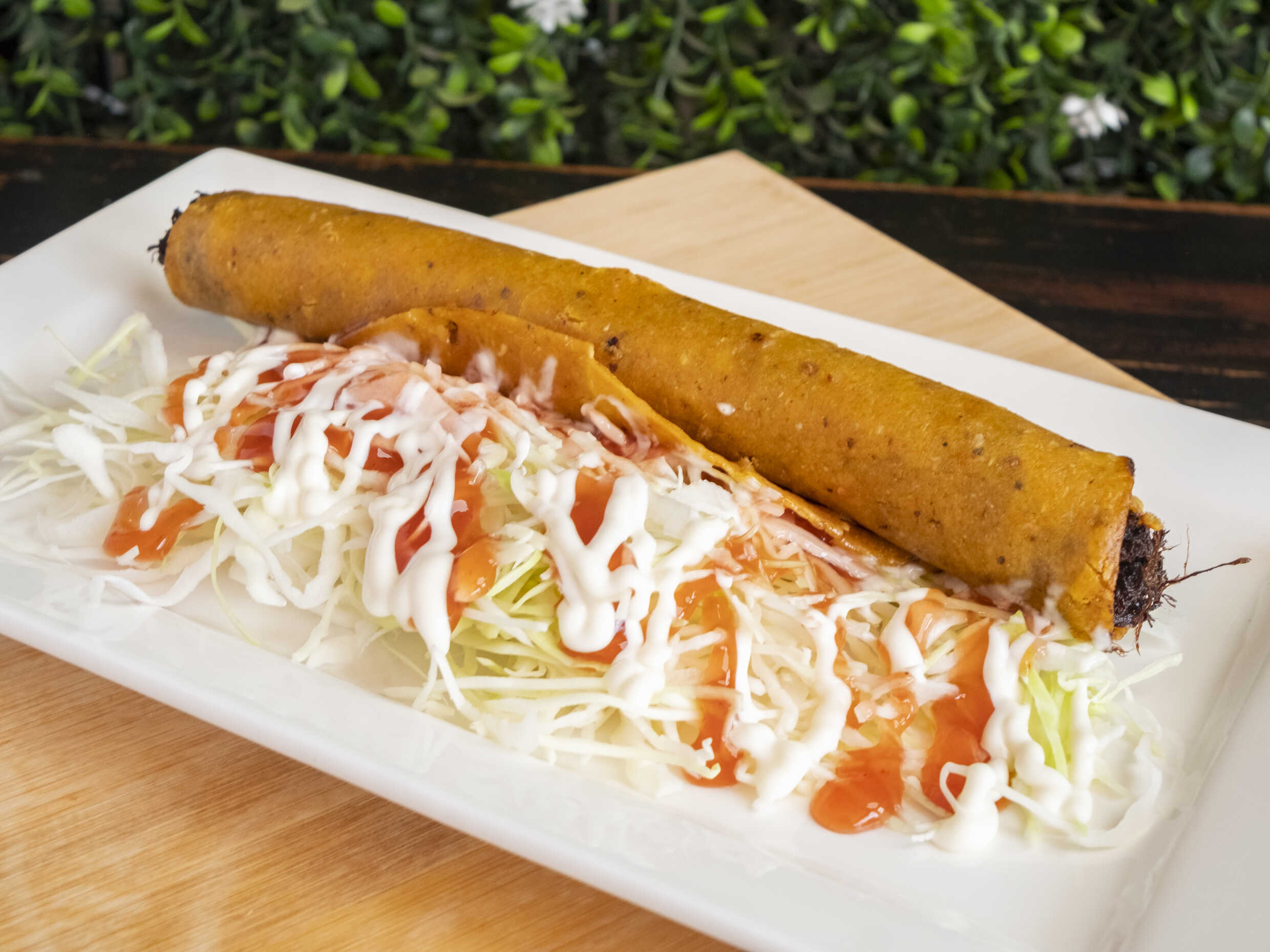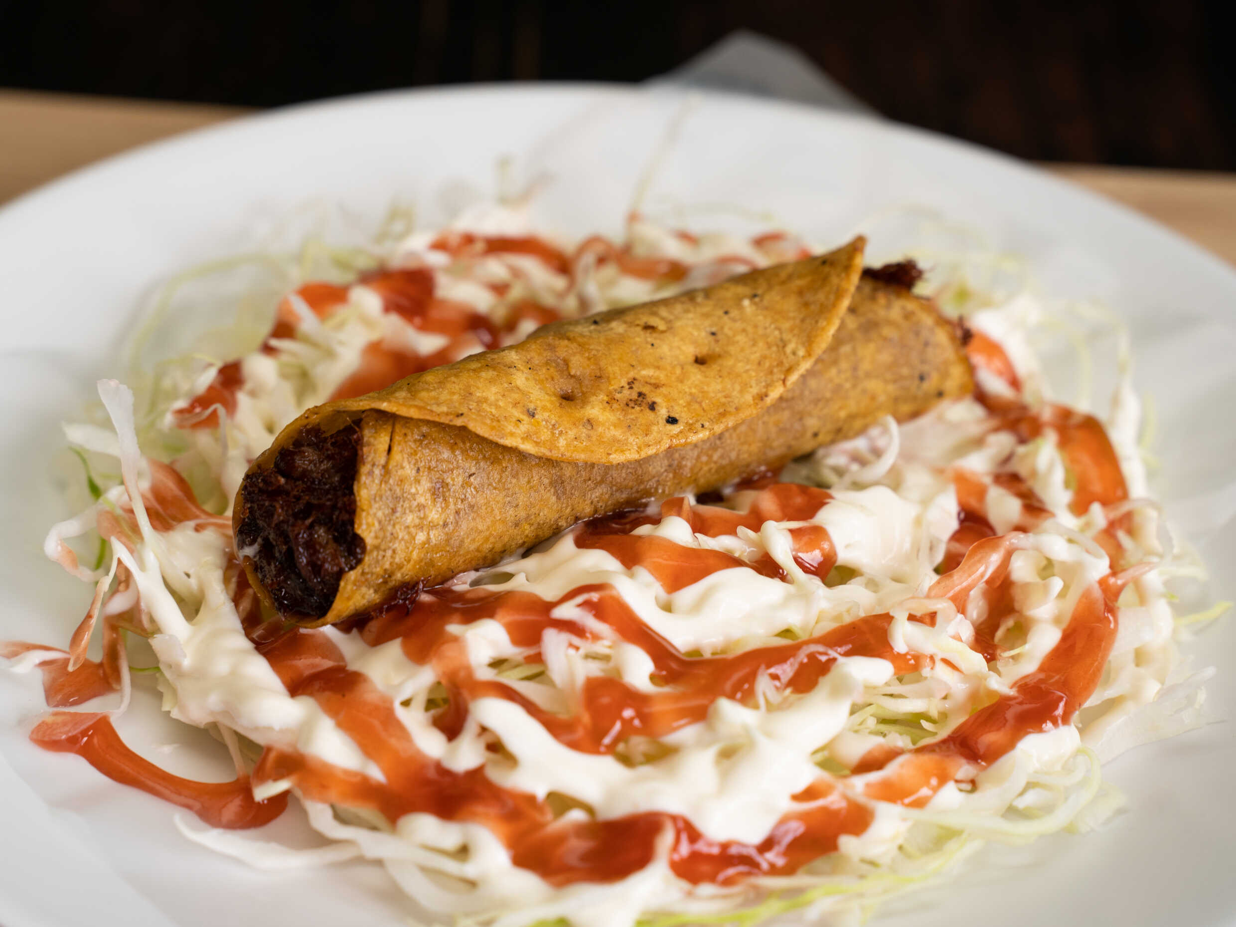 Taco grande de carne, repollo y salsas.
