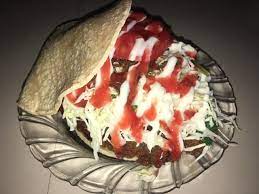 Taco de carne con queso mozzarella, repollo, salsas, acompañado de papas fritas y salsa de queso cheddar.
