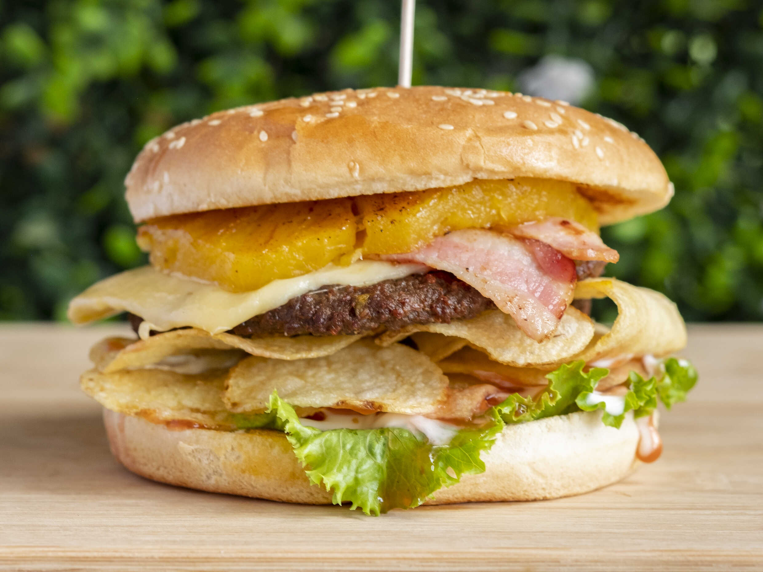 Torta de carne, rebanada de piña cocida, tocineta, queso mozzarella, salsas, papas tostadas, lechuga y tomate.