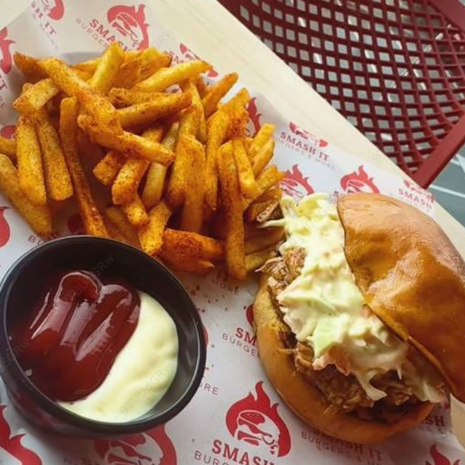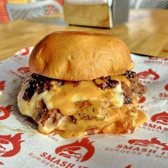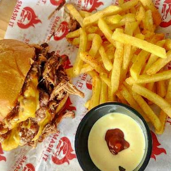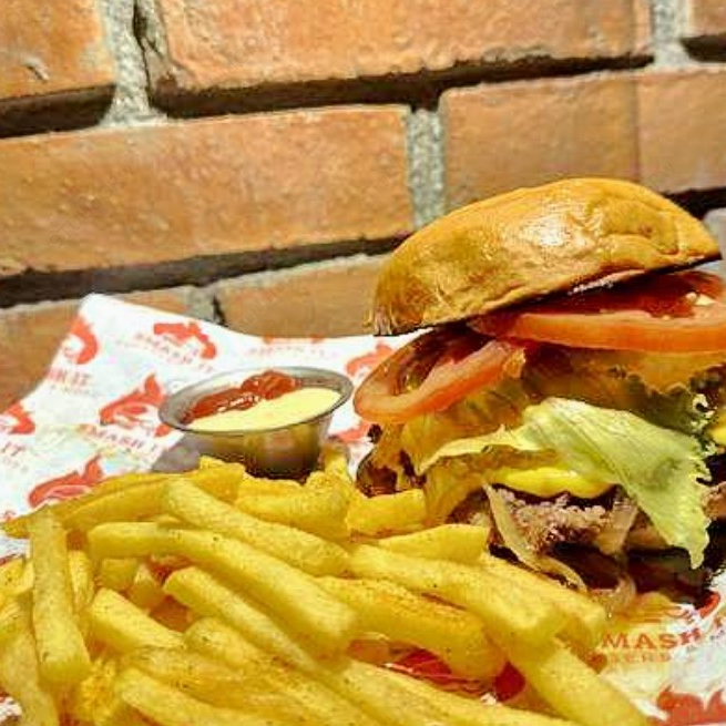 2 tortas de carne (carne de res) smasheada de 100gr, bacon (cerdo) crujiente, queso cheddar, pepinillos, cebolla caramelizada y salsa Smash It. Son salsas de la casa. Vienen con papas fritas sazonadas