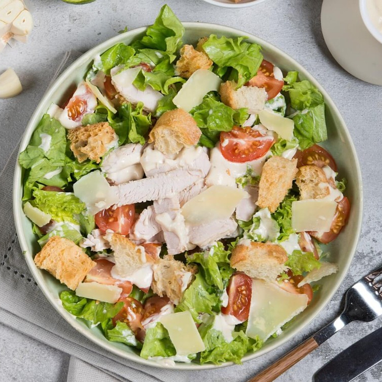 Lechuga, queso parmesano, pechuga de pollo, croutones (trozo de pan tostado con mantequilla) y aderezo César.
