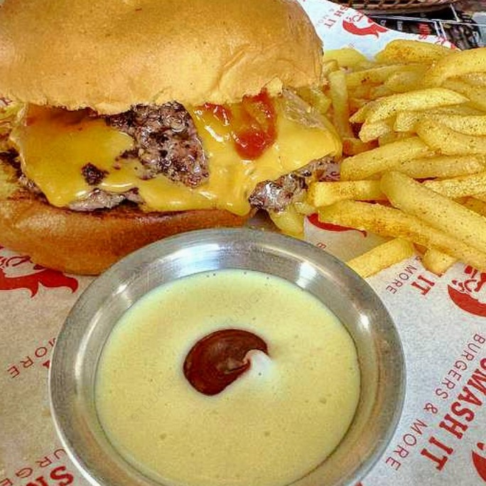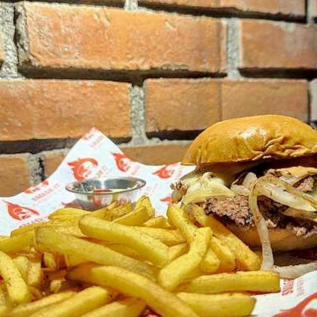2 tortas de 100 gr carne (carne de res) smasheada con cebolla, queso suizo y salsa Smash it . Son salsas de la casa. Vienen con papas sazonadas
