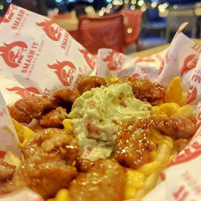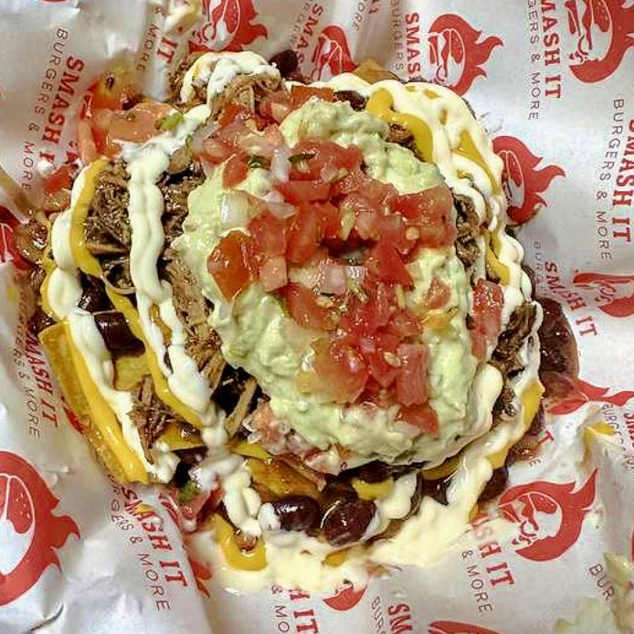 Papas fritas sazonadas con queso cheddar, guacamole y pulled pork (cerdo desmechado) o chikin (pollo) con BBQ.