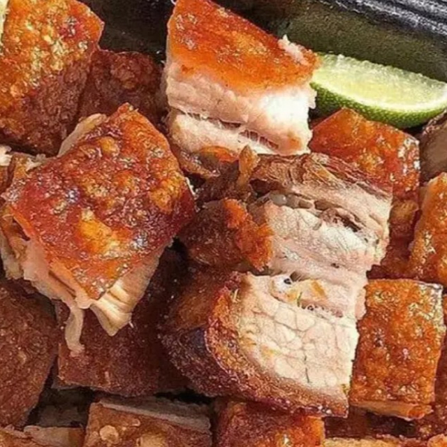 Chicharrón de cerdo, viene acompañado de guacamole y salsa jalapeña.