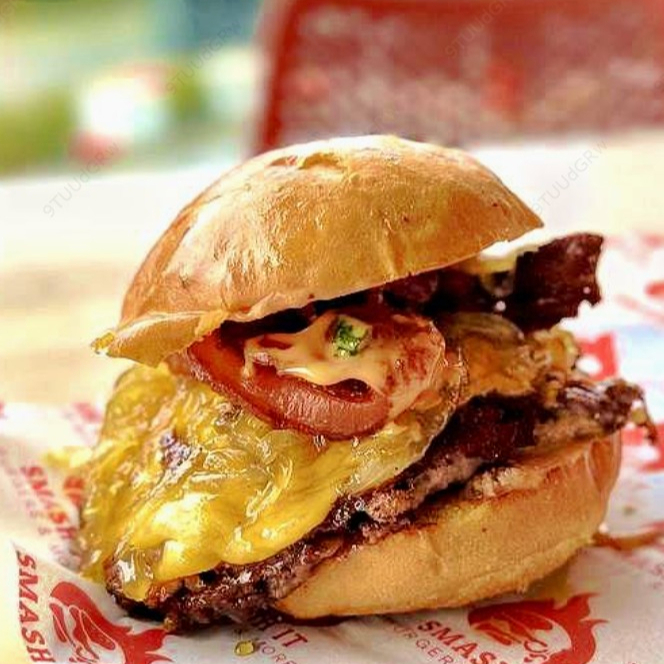 2 tortas de 100 gr carne (carne de res) smasheada, queso americano, lechuga, tomate, pepinillo, cebolla caramelizada y salsa Smash. Son salsas de la casa. Vienen con papas sazonadas