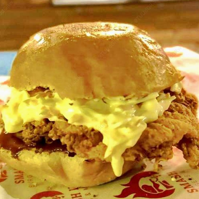2 tortas de 100 gr de carne (carne de res) smasheada, pulled pork (cerdo desmechado), queso cheddar, salsa BBQ y mayo chipotle. Son salsas de la casa.
