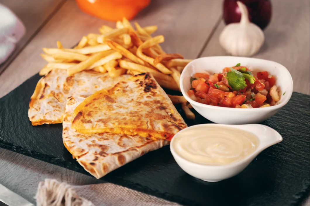 Tortilla de harina a la plancha rellena de proteína a elegir y bañada con salsa de queso.