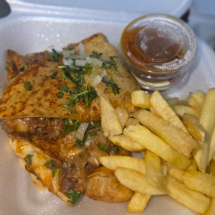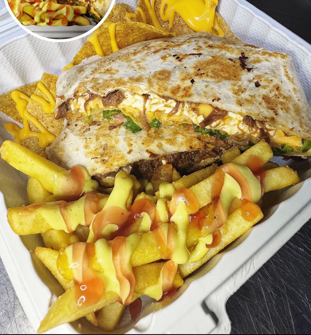 Deliciosa Tortilla de harina con queso rallado, carne, salsa queso acompañado de papas fritas