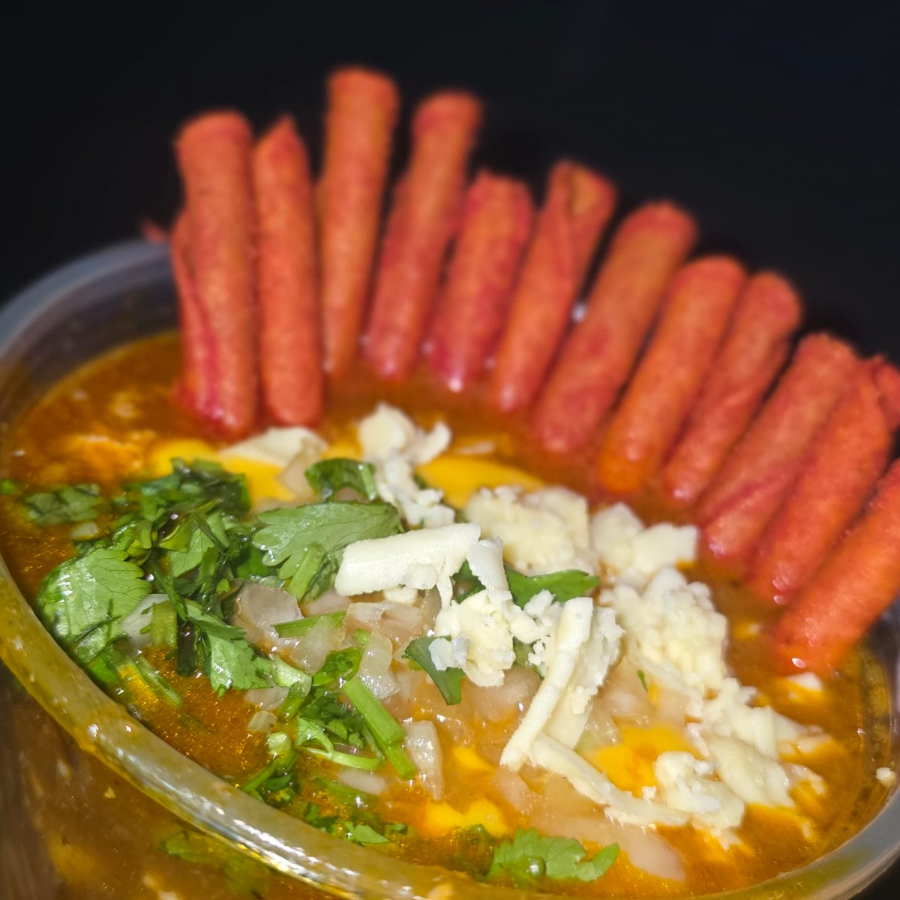 Tortilla de maíz con forma de canasta, frijoles molidos, lechuga, pico de gallo, elige tu proteína, salsa de queso y salsa de la casa + Papas Fritas + Refresco 250ml.