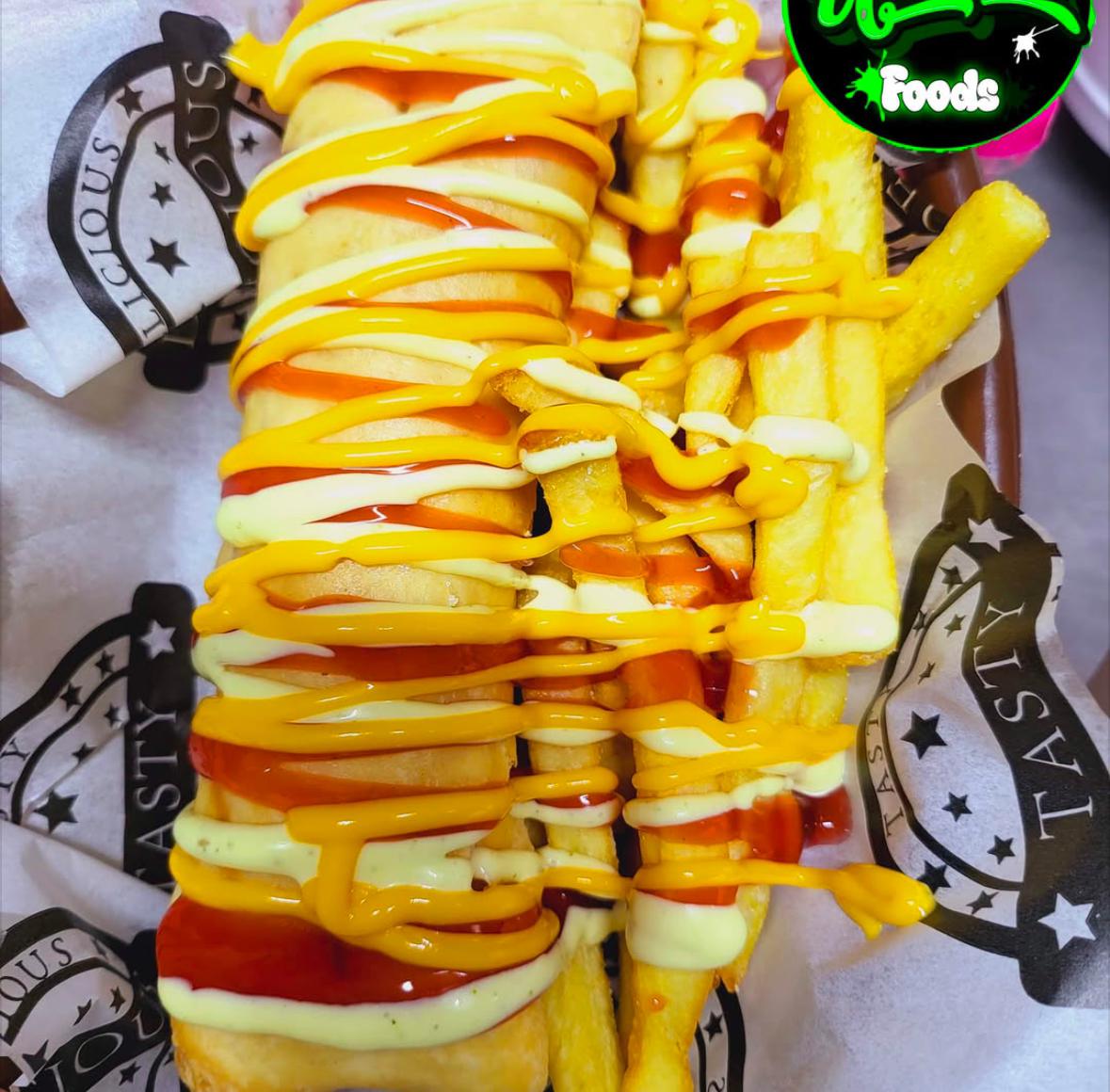 Perro caliente tradicional con pan, salchicha, repollo y salsas de la casa con papas fritas.