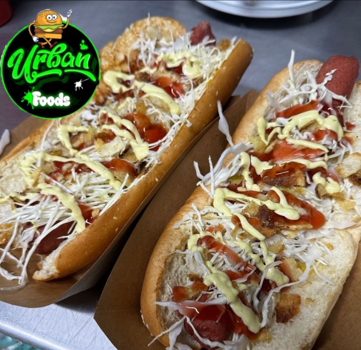 Perro caliente tradicional con pan, salchicha, repollo y salsas de la casa.