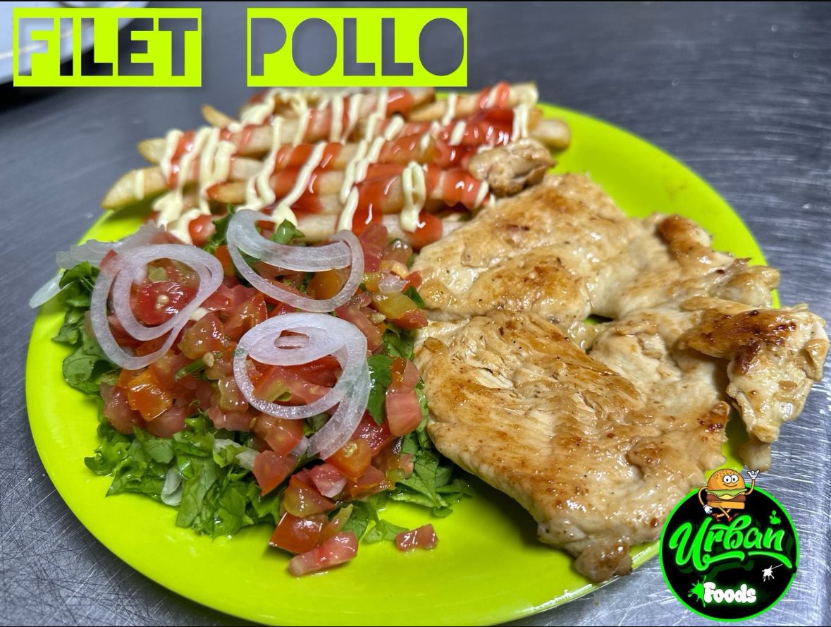Delicioso filete de pollo a la plancha, acompañado con ensalada, papas fritas y salsas de la casa.