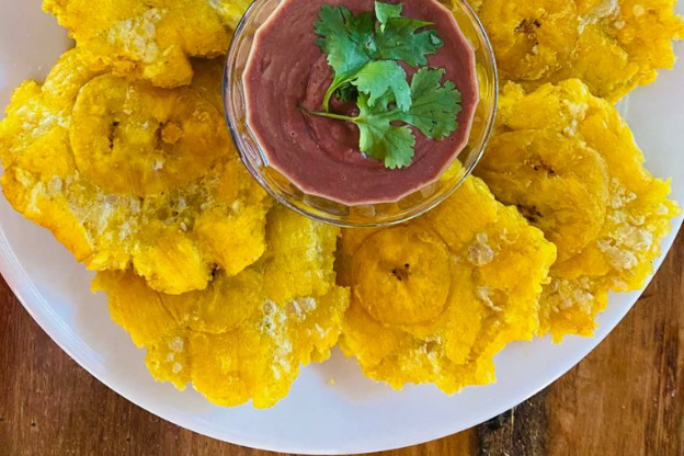 4 Patacones fritos con frijoles molidos y queso blanco rayado.